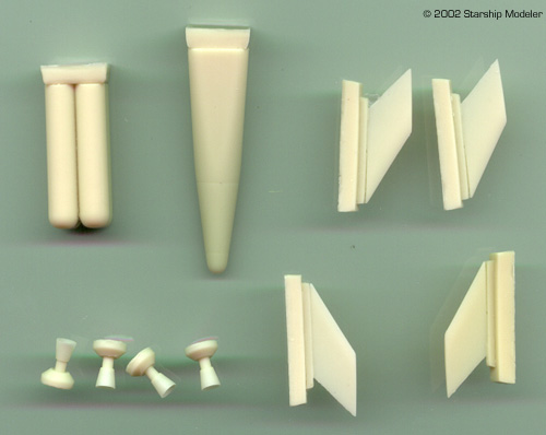 The goal was to orbit a small (2 pound) satellite. Six rockets were launched. Although not likely, two might have successfully reached orbit. New Ware's kit is listed as a conversion for Tamiya's 1/48th scale F4D Skyray. I think it can be thought of as an ordnance kit. It is simply the rocket which attaches to one of the plane's pylons like a drop tank. The rocket has ten beautifully cast resin parts. No bubbles to found on any of the parts. I was especially impressed with the four tiny, delicately molded engine nozzles. By the nature of the subject, there isn't much surface detail. The rocket appears to be accurate in shape based a couple photos I've seen. It is more accurate then the Peter Alway drawings in my opinion. Getting the calipers out, I found the kit's dimensions to be very good. Those dimensions that I could check, where well within .01". I'm not really that anal, but I couldn't resist checking. Above all, the kit LOOKS like a NOTSnik rocket! Also included is a set of decals for the carrier aircraft. It has aircraft numbers and 'CHINA LAKE' markings appropriate for the Skyray. These are to be used with the stencils and national insignia decal Tamiya provides. The instructions have good painting and marking directions based, I think, on a photo of the chase plane. There aren't a lot references on the NOTSnik, but there are some. I would recommend checking out (or even joining) the Yahoo space-modelers groups at http://groups.yahoo.com/group/space-modelers/messages. Notsnik has been the subject of discussion on this group and there is some useful reference info in the vault archives. Assembly looks pretty straight forward. The only tricky part appears to be cleaning up and installing the engine nozzles in the correct place and angle. |