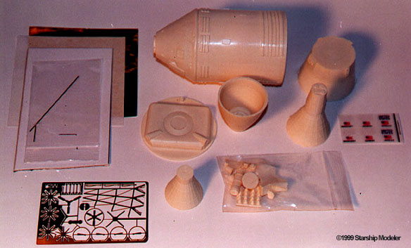 ^ A photo of the manufacturer's build-up, showing the completed family. This is also the best painting guide supplied with the product. The base and support rods do not come in the kit. ^ Here are the (circa '96) parts. Aside from improving the casting quailty since then, there were several parts enhancements, such as supplying hollowed out RCS thruster bells. |