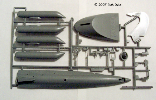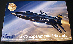 Yes . . . I actually waited until I got home to open the box! What You Get The kit is molded in light gray styrene and has raised panel lines. Overall detail on the kit is pretty good, with only some minor flash around a couple of parts. Details include a full cockpit, but only a standing pilot figure. Modifications could easily be done to another 1:72 scale figure if a seated figure is desired. Also included is the aft two-wheeled dolly used to move the aircraft around on the ground. The kit also has the nose landing gear, but, while the aft landing skids are included, Revell didn't include any struts to pose the skids in the landing configuration. Brass rod could probably be used to make the skid struts if desired. Revell also included a two-piece stand that is inserted into the afterburner. This kit represents the X-15-A-2. This is the aircraft that is on display at the US Air Force Museum. The A-2 version was rebuilt from aircraft number 2 following a crash landing in 1962, and featured a fuselage that was stretched from the standard length of 50.7 feet to 54 feet. The aircraft was fitted with a dummy scramjet that was attached below the lower fin. This scramjet is included in the kit, as are the dual external fuel tanks. |