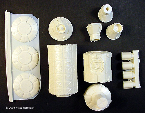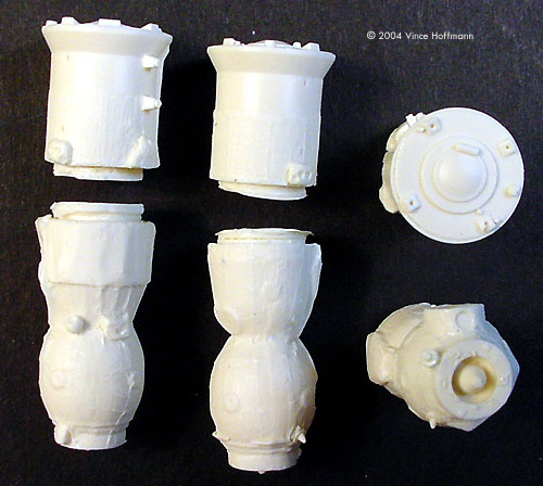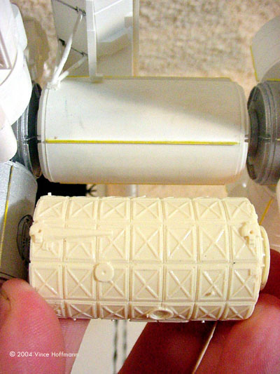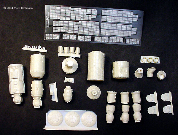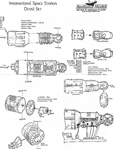 The newest addition to the fine collection of kits currently available from RealSpace Models is a long-awaited set of correctly detailed modules for the International Space Station kit. Although this kit is made for the Intermountain Railway ISS kit, the parts can also be used for the Revell kit. The Kit This detail set includes all the pressurized modules presently on orbit with the ISS. Each one is accurately textured and replaces the corresponding modules from the InterMountain ISS kit. Two Soyuz and one Progress are also included. The kit also includes a double-sided photo etched sheet for replacement Russian solar arrays for the modules and the spacecraft. The parts came packaged in a bubble-wrap baggie, and unloading the parts from the bag revealed a multitude of very beautiful castings. I found very finely cast parts with few defects and excellent detail quality. Small bubbles are found in some areas will be easily repairable with putty, and seam lines are fine enough to remove with a sanding stick. Most of the parts are cast whole with one end left separate and small pour lugs which can be removed with either a hobby knife or razor saw. Upon close inspection of the US module parts, very small pinholes can be seen along the edges, and at first glance they would appear to be air bubble voids, but are actually cable connections and handhold attachment points used by the astronauts. All of the parts appear to be attached to one another by gluing the exposed surfaces together. This method alone will not be enough to support the weight of the entire assembly once completed. I recommend that each major assembly should be pinned together with short brass or aluminum rods to help bear the weight and prevent joints from breaking. Attention to Detail I am very impressed with the quality of work on these parts, and in particular the parts breakdown. Each module is cast separately so the modeler can select and build the kit in a specific chosen level of construction. Each module is correctly textured, depicting the layered metal skin found on the US Modules and the Russian's use of exterior insulation and variety of surface-attached equipment. |