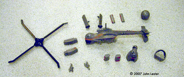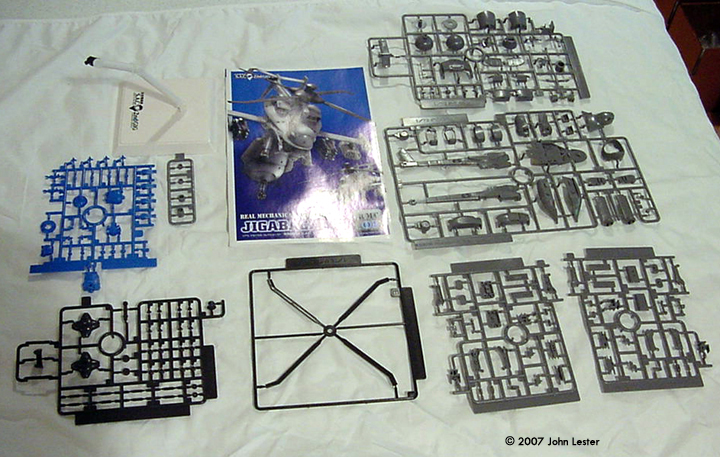 It's the first in Kotobukiya's new Real Mechanical Collection series of plastic model kits - and if it's any example of what's to come, I'm pretty excited! What You Get Inside the colorful box are 7 parts trees in blue, grey, white and black plastic, bagged to prevent scratches and keep any parts that may detach in transit from Kotobukiya to you from escaping. Parts are provided for the Jigabachi (in flight or landed), a 1/72 Tachikoma, and a stand/display base to display them together. Tere is a full weapons load for the Jigabachi, including 8 missiles on 2 underwing MERs, and two each of two different rocket pods Also provided is a multi-page, fold out assembly/finishing guide. Molding quality is what you can expect from a state-of-the-art Japanese manufacturer: sharp detail, no flash and minimal mold seams and sink marks. Panel lines are finely engraved; raised detail is crisply delineated. Subassemblies are thoughtfully engineered so that joins between parts generally fall on panel lines, or are covered by other subassemblies. The assembly guide consists of 18 exploded diagrams (15 for the helicopter, three for the Tachikoma), a color paint guide and reference drawings/description from the anime. All text is in Japanese - which makes the reference portion kind of moot for us gaijin, but which isn't really a problem for building and painting. The assembly diagrams are very clear and easy to follow, and the paint guide (which looks to have call-outs for Gunze and Tamiya paints) is easy enough to decipher, since it's printed in color. Assembly and Finish Assembly is straightforward, and as you can see from the pictures, I as able to have the major sub-assemblies for the Jigabachi together and ready for paint in about 2 hours. |