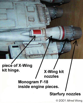 Step 4: S-Foil Assemblies: Make some 30-degree angle pieces and assemble sets of S-Foils for each side. Test-fit in the cut-outs as you go. Step 5: Engine Nozzles: Stack up the parts as outlined in the illustration. The cylindrical bits are just cut-off ends of the hinge halves from the X-Wing kit. The cones are the engine insides from the 2 F-18s, then add the X-Wing nozzle pieces, the Starfury nozzles finish the assemblies nicely. Step 6: Torpedo Launcher: I wanted to find something interesting to use for the new launcher, and settled on half of a spare chaff dispenser-pod left over from a built 1/48 Italeri Tornado IDS kit. I just added a new front piece and did some minor modifications. Obviously, you may use something different, just try to keep it interesting yet simple, not just any old plain missile-half. Finally, I made other minor improvements, such as a less-cluttered, more advanced-looking cockpit; as well as new sensor blisters on sides of the the nose. I finished it in the markings of Rogue-11, Jaina Solo's starfighter. I used substantially less weathering than on my old X-Wing. I even made a little Jaina for the cockpit. |