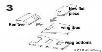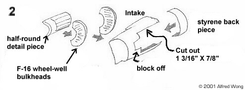 In deciding what the XJ should look like, I wanted to keep as much of the X-Wing as possible, while making it look more lean and up-to-date. It was also an opportunity to trim down that big back-end. The X-Wing studio models had that big, boxy rear end in order to house the S-Foil operating gear. I will outline 6 major steps for building the XJ. I used the large scale AMT/ERTL X-Wing kit, and used parts from 2 old Monogram F-16 kits and F-18 kits I have kept just for parts. Engine nozzles from a Starfury was also used. A small illustration is included for each of these steps. Step 1: Fuselage: Cut back the rear fuselage box by about 1 inch, and remove a good 1/4 inch from the bottom. Cover the bottom with a piece of .60 thou styrene, fill the edges and sand smooth. Add some panelling detail and landing gear doors to the new bottom. Blank off the back with styrene and add detailing. It's a good idea to modify the existing X-Wing details as much as possible for the sake of continuity. Step 2: Intakes: Assemble 2 sets of F-16 intakes (front & 2 sides). From the back edge, make a cut-out 1-3/16 inch long X 7/8 inch high for the wings, (you'll need to block out the remainder of the nose-wheel bay opening). Add a 3/8 inch strip of styrene to the back ends. You can use the detailed wheel-well bulkheads from the F-16 kits to box in the wing-insert opening. You will also need to make some kind of half-round detail piece for the inside, attach this to the bulkheads. Step 3: The S-foils: Remove the engine-mounting boxes from the 4 wing tops and replace them with flat, detailed styrene pieces cut to fit. These pieces should have an extended insert that will fit into the intake cut-outs. |