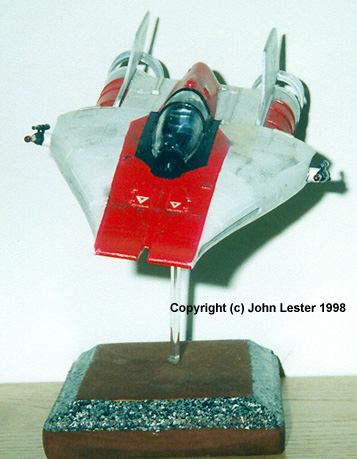 The A-Wing makes its one and only appearance in the ERTL's kit is (at time of writing) no longer available in the US. I got mine by trading a guy in Australia for something he couldn't get there. You can try that avenue - or check the UK's Star Wars Emporium or Q's Continuum for availability. When the package came, I could barely contain myself. My enthusiasm waned when I actually opened the box, however. It shouldn't have. Don't let the fact that this is a snap-fit kit fool you - unlike ERTL's TIE Interceptor, this kit actually fits together. Parts are crisply molded and with only 18 or so of them (including three clear parts) it goes together quickly. The raised panel lines are a bit overdone, but I was too lazy to do anything about them .... and that's my only complaint about the kit. Assembly is straightforward - and for once, one can even follow the instructions and not go wrong. I found it easier to snip off about half of each of the long attachment lugs so I could get a better fit without resorting to clamping parts in a vice. I glued everything, though the fit is so tight that it's not necessary in most areas. Imagine that. The only seam that needed fixing was along the sides of the fighter, where the top and bottom halves meet. I filled this with putty, sanded smooth, and then covered with a piece of 1lb test fishing line cut to length and super-glued in place. This replicates the raised panel lines found on the rest of the model. Lastly, I drilled out the concussion missile launcher "tubes" along the side of the ship and the barrels of the blaster cannon. I kept the engines off until the end, to make it easier to paint everything. I ditched the pilot and the landing skids - too ugly - and puttied over the holes where those pieces were supposed to fit. The real fun with this kit is in the painting. The cockpit is not bad - not tremendously detailed, but since there are no reference photos of the area (at least that I could find) I didn't worry overly much. I borrowed from my experience with aircraft models to dress the interior up. Sidewalls and "dashboard" received a coat of Testors Model Master (TMM) Aircraft Interior Black - a dirty dark, dark grey that looks more "scale" than flat black. The floor was painted flat black. Mixing subtly different colors like this gives a 3-D look to the area - try it, you'll see. The seat frame became Euro I Grey - again, a lighter shade of black - with dark grey seat cusions. The instrument panel was probably wrong - but without references, I can't say how. I left it as-is, and drybrushed the various instrument dials camoflague grey (which looks better than flat white for the same reasons as noted above with blacks). The "screen" was painted a flat light green, and various lights picked out with red, yellow, green and white. After everything was dry, I placed a drop of thined white glue over each instrument dial face - it makes a nice 3-D effect when it dries. For the canopy I used another old aircraft modeling trick. I dunked the whole piece in a cup filled with Future Acrylic Floor Polish. Then I pulled it out (using a pair of tweezers), wicked off the excess liquid that collected in an inside corner with a piece of paper towel, and set it under an overturned bowl to dry (the bowl keeps dust or cat hair from attaching itself to the wet floor polish). Another technique that works well is to polish the clear piece with an extrafine auto polish "swirl remover" (I use Meguiars), then wax with carnauba wax .... which produces stunning results, though I've not found the sci-fi kit yet that merits that much effort. With either technique, you end up with a crystal clear canopy. |