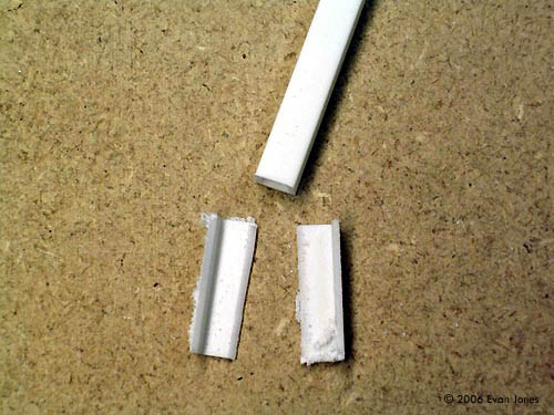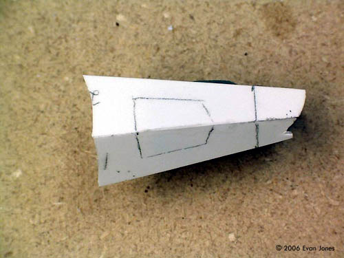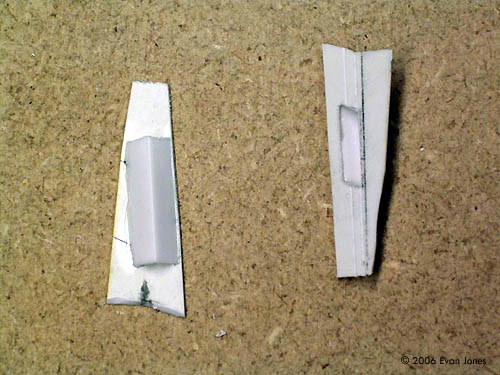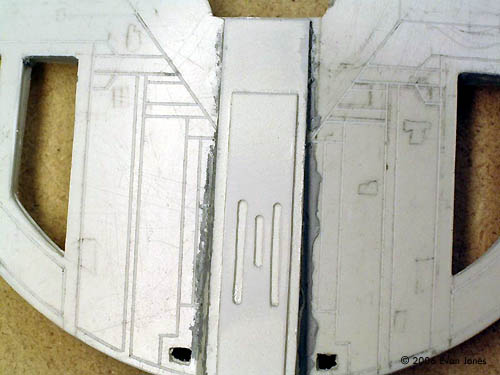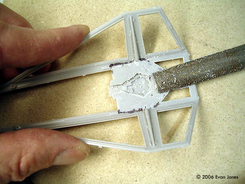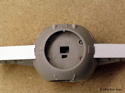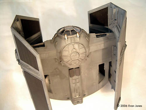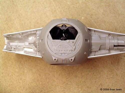 By turning the wings of the TIE Interceptor backwards, the front portion of the wings was pretty well done. The pattern of the solar panels is different than the TIE Fighter and is a raised, rectangular pattern. I thought that I would initially make castings of the existing solar panel inserts and splice them together to make the larger panels of the X1. However, this looked to be very time consuming and difficult to replicate accurately. In the end, I replaced all the solar panels with Evergreen V-Groove sheet styrene (number 2025, 0.64 mm (0.025) spacing 0.5 mm (0.020)). This gave some texture to the panel, although not perfectly accurate. The kit panels were used as templates for making V-Groove replacements. Care was needed because not all the panels were exactly the same some edges needed to be beveled to fit correctly into the frame. The longer top and bottom frames of the Interceptor wings were cut off. These were then cut and filed to make the longer back portion of the wing. There was just enough of the frame to complete the top and bottom of the wing. Styrene strips were used to build a frame for the center part of the wing. Using the MPC kit as a reference, various styrene sheets, strips and rods were used to add the detail to the inner part of the wings. The outer part of the X1 wings have a circular shape that is not quite the same as on the TIE Interceptor. A mold was made of the shape from the TIE Fighter and two pieces were cast from resin. These pieces were then cut to shape and added to the wing, with some putty used at the joints. The Pod Arms The arms connecting the pod to the wings are bulkier than the TIE Fighter/Interceptor kits. The arms were also at a different orientation with respect to the cockpit - flat on top and bottom, whereas the TIE Fighter/Interceptor arms were pointed. In addition, there were some mechanical details sunk into the arms that needed to be replicated. The conversion started by assembling the TIE Interceptor cockpit. This meant that the interior had to be built up first (see below under Darth Vader figure). The arms were cut off with a razor saw, turned 30° and glued back on. Sheet styrene strip 0.5 mm x 6.4 mm (0.020 x 0.25) was first added to the upper and lower arms. Sheet styrene 0.5 mm (0.020) thick was used to make the other sections of the arms. Openings were made for the inset details for both the front and back of the arms. Styrene shapes at 90° were cut and placed behind the rear openings. These were glued on and detailed with styrene rods of various thicknesses. The larger front openings were made from cutting square styrene tube, splicing in a triangular piece and adding to the arms. In order to minimize the use of putty, all the pieces were cut precisely and bevelled on certain edges to make the joints and gap free as possible. Panel lines were scribed to match the lines on the larger MPC kit, although they were simplified somewhat. I learned the hard way that the panels should be scribed before being glued on. The Body The X1 has an elongated body section on the back. There are two distinct sections to this