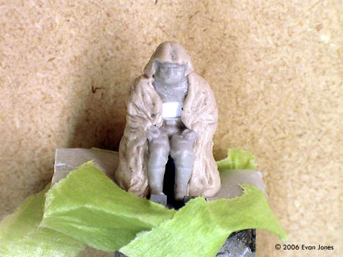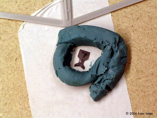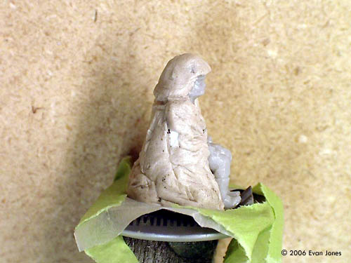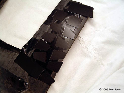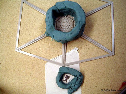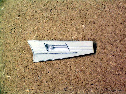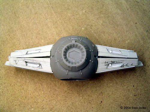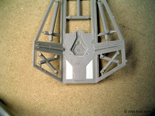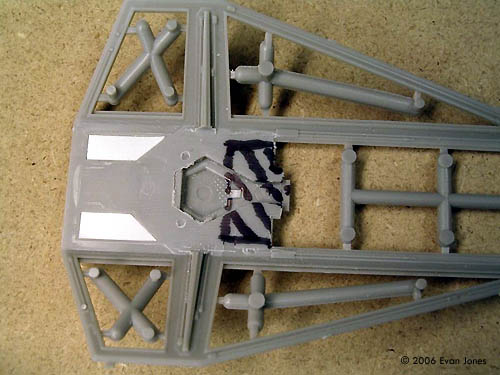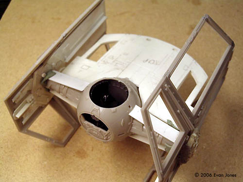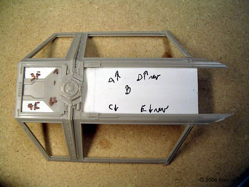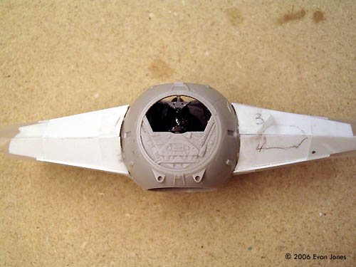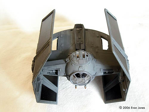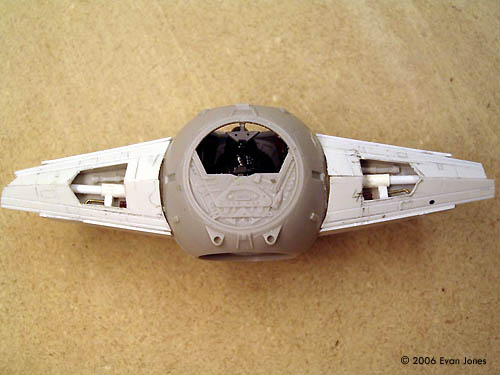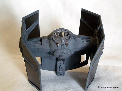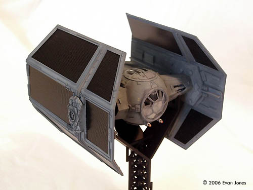 The longer, rear section of the body was built using sheet 0.5 mm (0.020) sheet styrene and the MPC kit as a guide. Two copies were laid out for the bottom and the top, with the four holes and panels drawn on the sheet styrene. Since the rear section was not the same thickness across the width or length, an inner bulkhead was cut out of 3.2 mm (0.125) sheet styrene. After scribing the panel lines, the upper and lower sheets were glued to the bulkhead in the interior and to each other on the outer edge. The front part of the section was shaped to fit the back of the pod and the new, thicker arms. The thicker center section was built using 0.5 mm (0.020) sheet styrene for the sides and top. Another piece of 0.8 mm (0.030) sheet styrene had the slots cut in them using a #66 drill for the ends and a sharp #11 blade and straight edge for the joining the holes together. Small pieces of styrene strip, rod and sheet were added for the various mechanical details on the body to match the MPC model. The MPC kit shows that there are four ion engines on the back of the cockpit, compared to two on the TIE Fighter/Interceptor. I made a mold of one of the engines and cast some extra pieces for these details. Dark Pilot Although difficult to see inside the cockpit, I decided to have some fun and convert the pilot figure to look like Darth Vader. It started by slicing the figure in half horizontally just above the arms. This location meant that I did not have to worry about changing the height of the controls. A section of 2 mm (0.080) square styrene rod was glued between the two parts. This gave the figure the correct height for Darth Vader. The bumps on the helmet and the hoses on the face mask were cut off using a hobby knife. The figure was glued to the seat, excluding parts A2 (seat back) or A11 (arms) as this would be covered by the new figure. Using the MPC figure for guidance, I then mixed up a two part epoxy used for fixing holes in wood. It is made by Polymeric Systems (www.polymericsystems.com) and can be found at various hardware stores (I got mine from Lee Valley Tools in Canada). This product is easy to work with, can be worked for about 20 minutes and can be sanded, drilled and painted after it sets. This epoxy was draped around the body and some folds and wrinkles sculpted using a little spatula. The helmet was done the same way. Once dried, the helmet was sanded smooth. A tiny triangular piece of .25 mm (0.010) styrene sheet was cut out and glued to the face to serve as the Darth Vader mask. The helmet, gloves, chest and boots were brush painted with Tamiya X-1 Gloss Black, while the rest of the body and cape were Tamiya XF-1 Flat Black. Silver and red paint was applied with a sharpened toothpick to the triangular face mask and the chest piece to simulate some of the buttons and details of Darth Vaders suit. The TIE Interceptor stand would not hold the new model because of the rear extension. The arms of the stand were modified to match the profile of the new arms. A third arm (from a TIE Fighter kit) was modified and glued in place to hold the rear section. Painting The solar panels were painted Tamiya semi-gloss black directly from the can, which gives a finish with much more gloss than using the thinned bottle paint through an airbrush. The rest of the model was Tamiya XF-66 light gray using my airbrush. Some smaller details were brush painted. An excellent masking kit from Starship Modeller was used to mask off the cockpit front canopy window and the top of the cockpit. Finishing Touches Left over decals from both the TIE Fighter and TIE Interceptor were placed on different spots on the model. The technique used was the following: