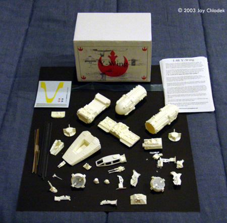 A large scale, good quality Y-Wing model has been the desire of modelers in recent times. There hasn't been much hope that a proper model of the BTL-A4 fighter would ever be done, until now anyway. SMT comes to the rescue with an all new kit mastered by Alfred Wong. This isn't the first time SMT has offered a Y-Wing in 1/48 scale. One was offered about five years ago, and although it had some fine features, some examples were marred by misshapen parts and seemingly tricky construction. So how does this new kit stack up? Contained in a rather small, white cardboard box are several mid-sized pieces for the nose, body and engine pods, as well as a bag containing all the small detail parts (cockpit, guns, engine vanes, etc.). The parts are cleanly cast in odorless white resin and are mostly free of imperfections. There are a few minor areas that need cleanup, but this is relatively common with resin parts. My example did contain some weird looking seams on the nose and one of the engine pods, usually indicative of a mold that flexed outward during the casting process. But I should be able to fix these and not every model will have this problem. The assembly sequence for the fighter is practically a work of art, as the small parts seem to lock together in making up the main body. A drop in cockpit and pilot seat is provided, where one might have expected a simplified arrangement molded into the nose instead. No pilot figure was provided in my sample, as apparently the pilots that SMT currently has on hand for their other kits don't fit this one without some modifications. But they do promise to send a pilot out when one is ready. Pilots should be available for the next batch of kits, scheduled to ship sometime in April 2003. The engine pods are hollow, cutting down weight and theoretically allowing a modeler to light the engines. The vane details are very nicely done and look very delicate, like on the studio models. Upon seeing them, I can appreciate why FineMolds is reluctant to tackle a Y-Wing in 1/72. ABS T-bar strip stock is provided for the engine vane support struts. Brass and aluminum tubing is also provided to represent the piping details found in the various Y-Wing studio models. The multi-page instruction book provides some excellent diagrams for proper piping locations. Two different astromech droid heads (R2 and R5 versions) are provided for the droid socket. Optional landing gear is also provided, but gear bays will have to be cut into the kit by the modeler as there are none provided here. Clear acetate is also provided for the canopy transparencies. Decals are also provided for the yellow nose stripping and gray side panels. Only minor drawback here is that Y-Wing studio models and full size sets also featured yellow striping on the bottom of the nose and sometimes yellow stripes on the engine pods. So matching paint coloring to decal coloring might be a chore unless a modeler just decides to paint all the yellow on. Accuracy? Okay, so the inevitable question is, how accurate is this kit?Well, the first thing to keep in mind is that no two Y-Wing studio models look exactly the same. Only the major details were mass produced, while smaller details were made up of different model kit parts and varied depending on what parts were used on what fighter. |