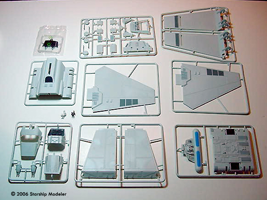 What You Get The Lambda-class Shuttle consists of 31 injected styrene parts, 2 figures, and instructions. All the plastic sprues are individually bagged to protect the finish. The plastic parts are pretty much free of any mold defects. Sprue attachments are thoughtfully engineered so that no painted areas should be damaged when the parts are removed from the sprue trees. Detail consists of finely scribed lines and crisply raised sections. Though several key sections are waaaaay oversimplified, the molding and minimal detail on them is nicely executed. Included is a pre-tinted windscreen that I particularly like - the finish looks like that on the back of a limousine, something I have a hard time replicating. You get a fairly well-detailed cockpit, plus two figures (pilot and Stormtrooper), but none of that will be seen through the tinted windshield. You have the option to build it with the landing gear raised or lowered, and the "wings" pivot for either in-flight or landed positions. Instructions are clearly illustrated in a series of exploded assembly diagrams. They are easy to follow and don't leave anything out. Is it accurate? Outline and proportions appear fine, and for the most part the model has everything it's supposed to have. Where it falls down is in areas which have been deliberately over-simplified to make them sturdier: the landing gear, gear doors and blaster cannon. No scale is given. If you go by the published length of 20 meters for the "real" vehicle and 165mm for the model you get 1/121 scale. The figures and cockpit are closer to 1/90, maybe even 1/87 (HO scale). Good thing you can't see them when it's built..... Assembly and Finish For the purposes of evaluation, I built this model straight from the box, armed with nothing but a sprue nipper. I sanded down none of the sprue attachment points (or anything else for that matter). Just snapped it together. Parts fit was pretty darn good. It would be improved with a bit of judicous sanding here and there, and the use of glue to hold everything together. I encountered no problems and the entire process took me just under 20 minutes. The instructions suggest you add ten grams of weight to the rear fuselage bulkhead, presumably to keep the model off it's nose. Mine sat on it's two landing feet esily enough; you could probably get the same result leaving the figures out of the cockpit as you could adding weight. The kit is pre-finished, so in theory you should not need to paint it. The "pre-finishing" consists almost entirely of details highlighted with accent colors (blacks and light greys), plus the windscreen tinting and blue engine glow. The painted parts are nicely done, but the overall effect of all taht bare plastic is toylike. Pros and Cons On the plus side, the model appears accurate in outline and proportions, fits well, and is simply constructed. there is plenty of room for a serious modeler to paint, weather and detail it. It's also a size that won't hog a vast amount of shelf space like the old AMT kit. Compared to the AMT kit, the Revell is (in most places) more crisply detailed and it certainly fits together better. On the minus side, the landing gear (and to a lesser extent the blasters) are hugely over-simplified. |