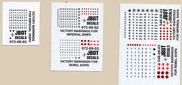 J-Bot Decals have been around for several years, catering mainly to auto and aircraft modelers. Lately, they have branched out into sci-fi. Their first two releases are supplementary markings for Monogram's old Buck Rogers Starfighter and kill markings for Star Wars ships.
