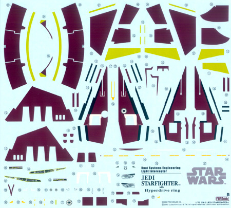 What You Get The kit is comprised of four sprues of white plastic in two bags, a small clear plastic sprue, two decal sheets, and separate instructions for assembly and decal placement. Despite the small size of the ship, the box is pretty full. You get the starfighter, a seated humanoid pilot (Obi-Wan Kenobi), astromech dome, the hypersled and separate bases for the sled and fighter. The plastic parts are about as fine an example of what's possible with injection molding these days as we're likely to see. Panel lines are finely engraved, raised detail is sharp and well defined. All the details, engraved or raised, are crisply rendered. As befits a new mold, there was zero flash on my example. Mold seams are so light as to be almost non-existent, and the only ejector pin marks I saw are on inside surfaces where they will not be visible when the kit is built. Decals are of the silk-screened waterslide variety. There's at least 175 of them, which provide all the markings for the ship and hypersled. You could conceivably get away with not painting the model, but it will no doubt look better if you do paint the white basecoat. The decal placement and assembly guides consist of several steps, each "explained" by line-drawing diagrams. There is quite a bit of text, all in Japanese, but it does not appear to be necessary to build the kit - no doubt it's the usual warnings against sniffing glue in front of a roaring fire. Parts and decals are clearly numbered, in physical form and on the instructions, so it should be fairly easy to determine what goes where. About the only place where a translation might be nice is the paint call-outs for Obi-Wan, but a quick look at the DVD/tape will give you all the information necessary. Assembly and Finish If you've built a kit or two, you should have no trouble putting this model together. There's a lot of small parts, however, so it may be more frustrating to the novice than the intermediate or experienced builder. What I see as probably the most frustrating part of the process is applying all those decals. There are some pretty small markings, and a lot of them too boot. On the one hand, masking and painting all the large red areas would be a real chore; on the other, getting decals to perfectly align will be one as well. You'll need patience and several sessions to get though it, but the results should be worth the effort. Applying weathering effects over the decals might be tricky, however. Conclusions The Jedi Starfighter is a sharp-looking kit in the box, and should build up into as impressive a model as the X-Wing and TIE/Fighter. The large number of small parts, coupled with the massive decal sheet, make this a project that the inexperienced and impatient should probably avoid. Recommended for modelers with some experience. Many thanks to my wallet for providing the review sample. Manufacturers and retailers, interested in getting your wares reviewed and publicized on a site averaging 3000+ readers a day? Contact us! |