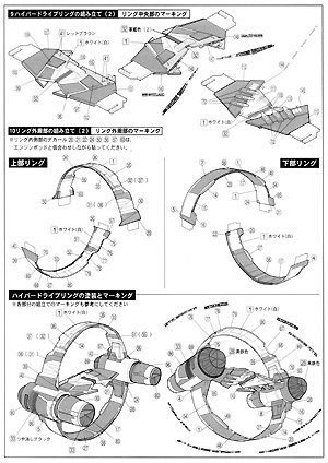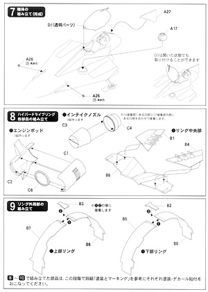 ^Not very big at all .... ^ This sprue holds most of the fighter Image: The second sprue makes up the structure of the hypersled Image: Two identical sprues provide hyper engines and two bases ^ One decal sheet is for the fighter .... Image: ... the other for the sled. Image: It takes 4 pages of diagrams to cover the placement of all those decals Image: Assembly instructions appear easy to follow |
