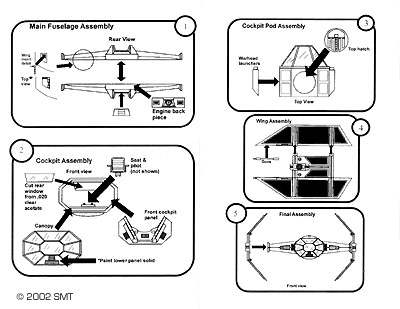 What You Get Safely ensconsed in the sturdy box are 18 resin parts (one of them clear and the other a pilot), 2 styrene tubes, 2 copper rods and two clear vacuformed plastic canopies, plus a sheet of instructions and another with a painting guide. At first glance, the parts look well-cast and well-detailed. Closer inspection confirms this, and indicates they'll fit well too. There was only a very little flash on my sample, as well as some bubbles in places where they won't be seen (the backs of the main hull, for instance). The resin used is apparently a different variety than previous kits I've seen from this manufacturer - harder and not as "chalky". Mold release is apparently less as well, though I'll definitely be soaking the parts in tire cleaner anyway, just to be sure (I thought the usual cleansers strong enough when used on my B-Wing, and found to my horror that neither paint nor superglue stuck!). The clear resin piece is devoid of bubbles and almost transparent. The kit masters obviously relied upon ERTL's "Darth Vader's TIE" as a starting point - but there's quite a bit of extra detail added to that base, and of course the command pod is all-new. The new parts blend seamlessly with the "old". The cockpit/command pod is very well done, with nice detail inside. Since the inside will be quite visible through the front "glazing", this area will benefit from any extra detailing you want to through in there. Two clear vacuformed canopies are provided, instead of the previous clear resin parts (as on the B-Wing). They're thick enough that cutting them from the backing shouldn't be an exercise in frustration (and you get 2 in case you do screw up), but thin enough as not to hamper viewing of the interior - especially after a dip in Future/Johnson's Kleer. Instructions consist of a brief history of the type plus some generic tips for working with the various media. On the back of the sheet is a simple assembly sequence is diagrammed. There's not a lot of parts, or much confusion as to where they fit, so building this beast should be fairly straightforward. No decals are provided, as the ships don't carry any markings. Those interested in cusomizing touches may want to investigate J-BOT Decals' Star Wars Kill Markings decals. Assembly and Finish I've taped the major components together and there appear to be few areas of concern - everything fits nicely. Based on previous experience, you'll want to make sure the kit is cleaned thoroughly before you start building, in order to make sure there's no mold release lurking on the surfaces. An old toothbrush and a non-abrasive cleanser like "Soft Scrub" should do the trick - but if not, get to a well ventilated area, grab some rubber gloves and a respirator, and break out the lacquer thinner or tire cleaner. My only concern is that the mounting points for the solar panels (the four large fin-like parts) will not be strong enough to take much abuse. They're quite a bit thicker than on the TIE/Defender, so replacing them with brass or aluminum strip is probably unnecessary. However, you'll want to leave those panels off until all painting and detailing is complete. |