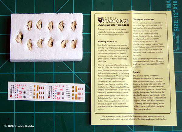 The debut release from Studio StarForge is a series of Rebel Pilots inspired by the popular science fiction movie epics. These resin figures, available in packs of five or ten, are ready for painting. Studio StarForge claims they will fit all 1/72 scale fighters - plastic or resin. There are five individual figures (the ten pack gives you two of each). All are in a conventional (and static) pose with hands in their laps and eyes forward. You get a Mon Calamari, Sullustan, male human in standard flight gear, another in what appears to be cold-weather gear, and a female (not sure the race on this one - could be human or demon). All feature full torsos and upper legs - they are cut off at the knees in order to fit into those ridiculously small cockpits. Each pack also includes a sheet of waterslide decals for helmets as well as some bonus warning placards and stencils for the model. These look to be laser-printed and have a clear overcoat covering the entire sheet. Detail on the figures is excellent, and should really pop with careful painting. My samples had no mold seams to clean up. However, all were marred by small bubbles or 'beads', and one of the Mon Cal pilots looks to be a thin skin of resin over a body of froth. Fortunately, the bubbles are in spots that won't really be seen once placed in a cockpit, and they're also easily filled. Because there are no mold seams to clean up, the frothy guy should not be in an issue either - no sanding means no exposing masses of pinholes, after all. Painting & Placing The detail on these will really reward the careful painter. Placing them in the models will be a bit of a challenge, though. Compared to a set of modern US pilots and ground grew from Hasegawa, the figures look “right” in size and proportions. Using my calipers to measure them from seat of the pants to top of the helmet and then scaling up, I get “real” heights of right around 6'1”; even taking the height a helmet adds, these drivers would be on the tall side. |
