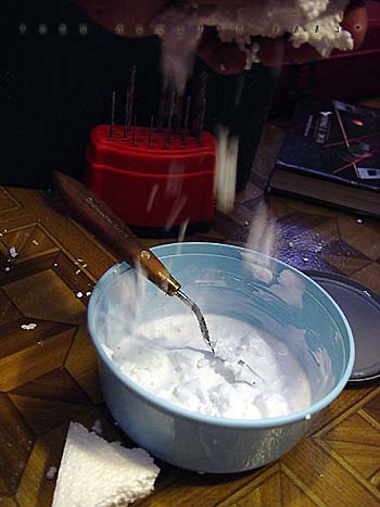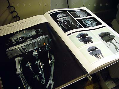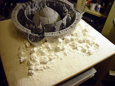 Plastic bathroom kickbuckets and clear craft bowls from a local Bed Bath & Beyond provided the basic parts to the pod. Another trip to 'American Science and Surplus' provided several small items to be used as well. Left over castings from past projects provided the extra detailing. The base was a box-like structure constructed out of hardboard and epoxied together. I built the snow up from styrene insulation foam secured with a hotglue gun. I covered the foam with a thick mixture of lightweight spackling and Future Floorwax to simulate the final snowy texture. This model won a Silver award and also a sponsored award for Best SF Vehicle/Mecha at Wonderfest 2003. Image: I found the kit needed a lot of work to get the detailing up to snuff, so I found some great references in this very large book called The Star Wars Chronicles.Image: The neck base where the head/turret rotates was extended a bit with sheet styrene. Image: Additional optic sensors were added to the head and the laser on the body detailed with bits of styrene Image: The actuators for the manipulator arms were redone. Image: The manipulators arms were detailed out and new hinges were made to accept the actuators. Image: The details of the kit were very simplistic so extra eyecandy greeblies were added to the undercarriage of the main body. Image: Black Krylon primer was sprayed on the kit. I think it was at this point I shelved the project. Image: Seven months later the idea of making a serious diorama re-energized me once again. This time I wanted the Probe Droid rising out of its half buried re-entry vehicle. A trip to Bed Bath and Beyond yielded a plastic children's Kick Bucket and a clear craft bowl. Image: An empty snow globe cylinder from American Science and Surplus. 3 were needed. Image: The snowglobe cylinders were halved and trimmed to fit. Again 3 had to be made. Image: The halves were now attached to the bowl. Image: A halved part of the kickbucket and some detailed spheres were dryfitted to add interest to the inside. Image: Some Alumilite castings were made for more mechanical details. Image: Coming together. Image: I primed the pod and the Probot was test-fitted on its gimbaled support. Image: A wedge shape base was constructed out of hardboard. The pod was secured with screws from the bottom. Image: Snow had to be replicated but I didnıt know how to go about doing it. I didnıt want to use plaster or baking soda because it didnıt look ight to me and wasnıt permanent enough, so I made up the following: To start off, styrene insulation foam was cut into little wedges and hot glued in place. This became the understructure for the snow. Image: Lightweight spackling was spread evenly onto the surface of the foam with an artist's trowel. Image: The result. But wait....... Image: ......a concoction of my own invention: Lightweight spackling and Future floorwax. Crumbly chunks of insulation foam was mixed in. Image: Itıs still wet, but the effect of displaced snow is taking shape. Image: The final result. Iım not sure how permanent this technique is but so far itıs still holding up. |