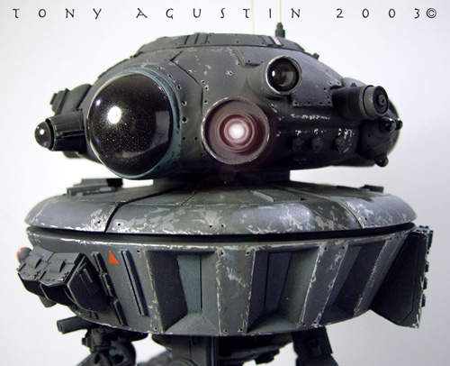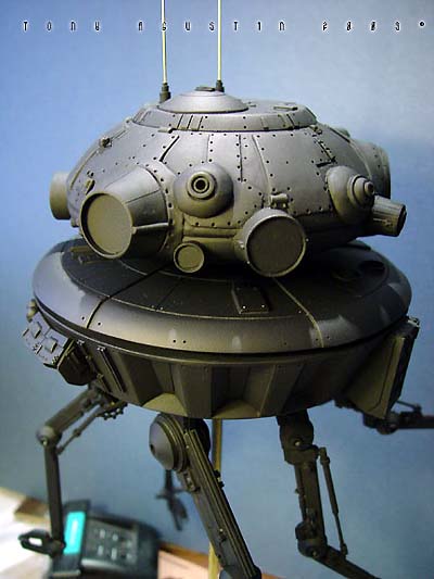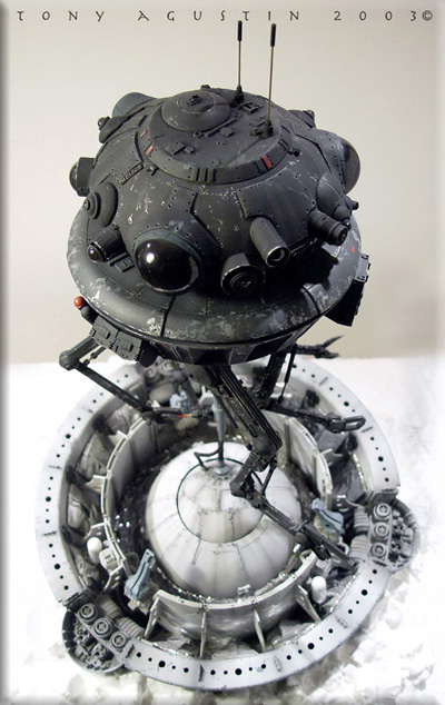 This was SMT's resin kit production of the Probot from the Empire Strikes Back. The 1/6 scale kit went for about $80 and was limited to about 100 kits I believe. Itıs been long since out of production. I had bought this kit over a year ago and started construction almost immediately. I found the kit needed a lot of added improvements to get it to look right, so I added extra detailing to beef up the underside and and added an extra 'eye' to the head/turret area. The neck attachment had to be raised a bit to get the head/turret to clear it's own laser when rotating. |