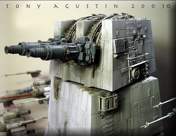 The understructure of the tower is 1/8" hardboard sheet cut to size and glued with a 2 part 15 minute curing epoxy. Then the entire structure was sheathed in styrene and the plating was meticulously cut one by one and cemented in place with liquid cement. I raided a local 'American Science and Surplus' store to search for anything that might make good candidates for the two turbo laser cannons. I raided my parts box and my 'never gonna be built in my lifetime' armor kits to locate appropriate details. I had to make multiples of some small parts so I used Alumilite's casting kit to make molds and cast the extra parts. Once all the details of the Laser Tower were put together, I sprayed the entire thing with Floquil Gray Primer. It was the perfect color for it. I weathered the tower in acrylics enamels using an airbrush and stippling with a paintbrush. The X-wings I built, painted and weathered in a little assembly line so as to finish them quicker. I ended up masking the bold red stripes and painting them on instead of using the decals. I didn't want the fuselage and wing panel lines to be obliterated by the thickness of the decals. Acrylic rod was heated and bent to shape to be the support arms for the X-wings. Holes were drilled into the both sides of the tower to accept the acrylic rods. For fun I wanted a couple of Storm Troopers to chase after the rebel fighters on foot brandishing their rifles, so I repainted two MicroMachine Stormtroopers and placed them in an inconspicuous area near the tower. This model got a Gold Award at Wonderfest 2003. Image: A simple profile of the tower was drawn up actual size to the model.Image: The drawing was transferred to a large sheet of hardboard. The pieces were cut out with a scroll saw. Image: The pieces were epoxied together to form the inner structure of the tower. Image: Sheet styrene was epoxied and superglued to the hardboard. Image: I made another drawing to figure out how to make the turret itself. Image: The turret mechanism was constructed from brass tube and thick styrene sheet. The cannons were made from pens and some electronic gizmos. Image: Here we see the turret sheathed and partially detailed with Evergreen structural shapes. Image: Plating started from the top on down. Horizontal strips were cut into individual pieces and secured with liquid cement. Image: Plating completed. A few kit parts were added around the turret. Image: Kit parts from tanks and a medical humvee were added next. Image: A base is constructed for the towerusing the same materials as the rest of the diorama. Image: Here we see the turret detailing finished. Staples were used for the ladder like hand grips. Small multiple parts were made from Alumilite (resin). Image: The Tower was primed and ready for weathering....or so I thought. Image: I found an additional reference photo that showed a more detailed picture of the side basket. I scraped off the primer on the appropriate side and added the additional detail. Image: I love how primer blends everything so nicely. Image: I weathered the tower with an airbrush using acrylic enamels. Additional weathering was done with a small brush. Image: Time to do the Finemolds X-Wings. Image: The X-Wings were primed, then a basecoat of Camo Gray with a touch of white was airbrushed on. Image: I decided to mask the bolder red markings instead of using the decals. I didn’t want the panel lines to be obliterated. Image: The red markings were airbrushed on. Image: All four of these X-Wings have their own distinct individual type of weathering and paneling. Image: The X-Wings were weathered and the remaining decals applied. A final coat of Gunze Sangyo Clear Flat was airbrushed on. |