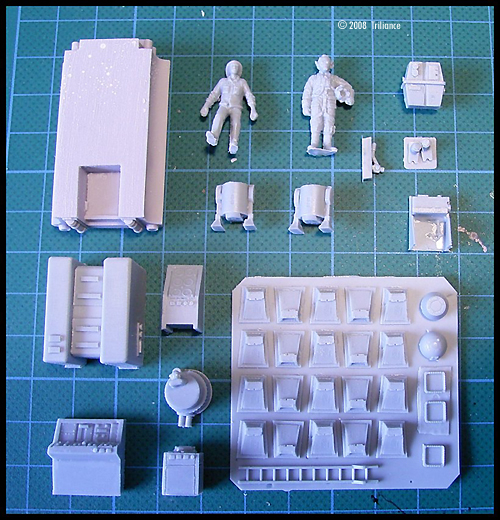 The two-piece (three, if you count a strip of styrene for the grab rail) repulsorlift tractor is detailed underneath but smooth on the topside - the details on the bottom are probably conjectural, but they look good. Detail on the various pieces is nicely done and adequate for the scale and small size of the pieces. Casting throughout is very good. I only found a few small voids, all on the back side of pieces where they would be glued to the deck. Flash was almost non-existent. About the only drawback I see is that the deck lights - which look like tiny droids or maybe "scutters" - plus the latter and astromech domes are all cast onto a not-insubstantial wafer of resin maybe .015" thick. I'm sure this was done for economy's sake when molding, but it does mean you will have to carefully sand the 'wafer' away from the parts before they may be used. That's tedious, but not difficult. No instructions are provided with the kit. The Trilance website, however, has some explanatory text and several photos that are helpfull. Conclusions If you want to do a hangar scene, or even just include some maintenance/service equipment to give your models a sense of scale, this is a very good start. There's enough parts in the kit you could spread them out between several models. The high quality of the parts and the castings should make them easy to use - pretty much just paint and place. Recommended. Many thanks to Triliance for providing the review sample. Manufacturers and retailers, interested in getting your wares reviewed and publicized on a site averaging 3500+ readers a day? Contact us! |