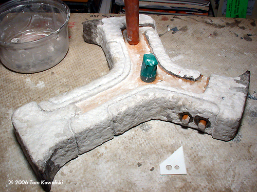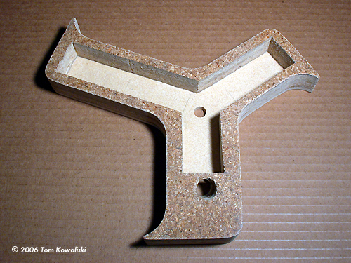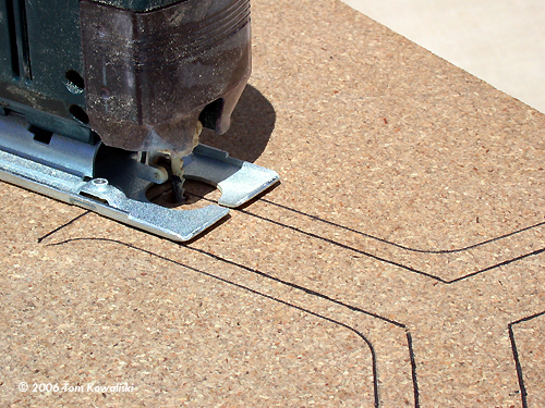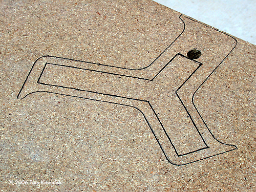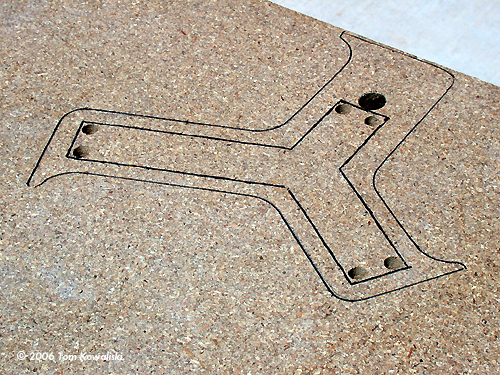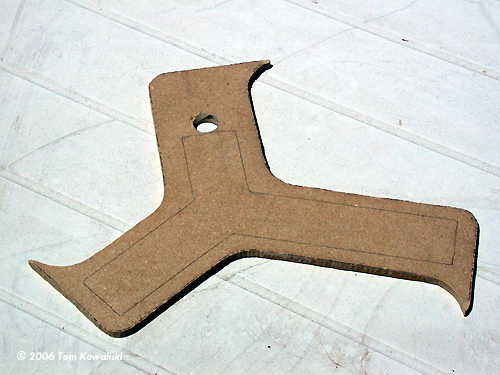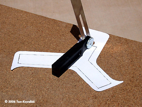 This particular display base, intended for my Blackwind project, is prime example of stonework made to order. It's a simple wood frame shaped to the modeler's needs, electrified, and then covered in whatever material you choose to simulate the rock. This is the first time I've photographed a project from start to finish so there's something new here for everybody. Part One: Wood It started with two sheets of half inch particle board laminated together. Actually it started months before that, drawing several different base designs for the Black Wind to roost on. I finally chose this three spoked pattern. I also chose an angled riser to allow an easier view of the models bottom detail. So I laid the cut out paper pattern on the particleboard and tried to determine where the model would center above the pattern. When the correct angle for the riser was determined, an adjustable guide was used to match that angle for drilling the holes. |