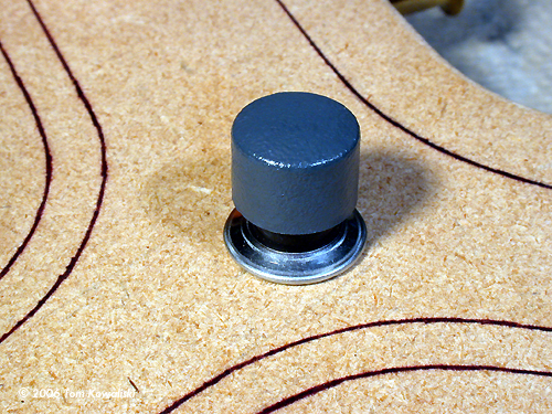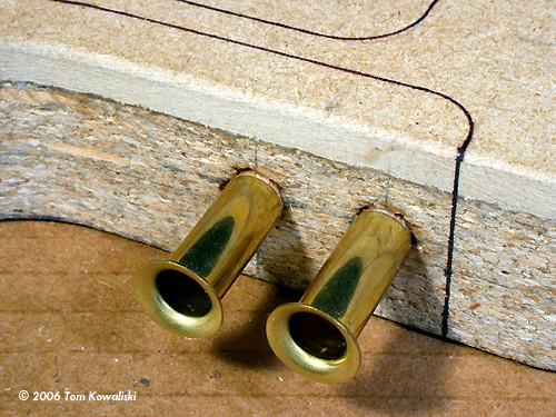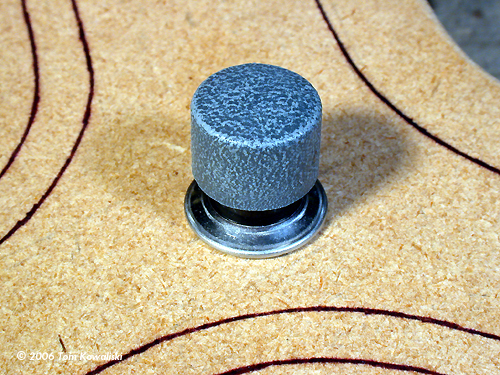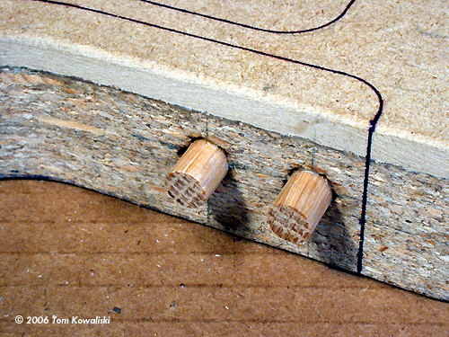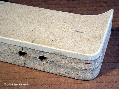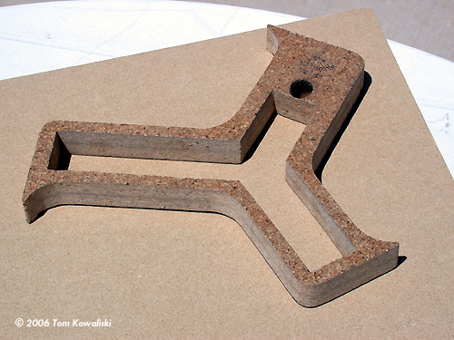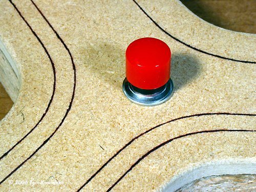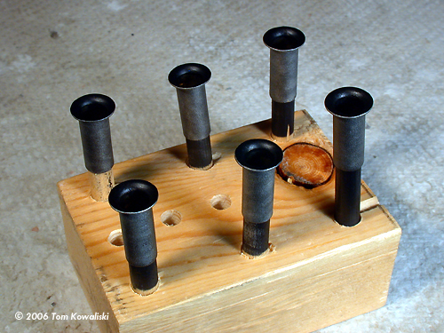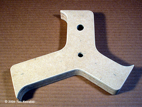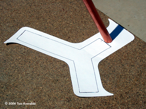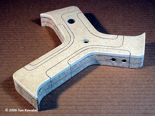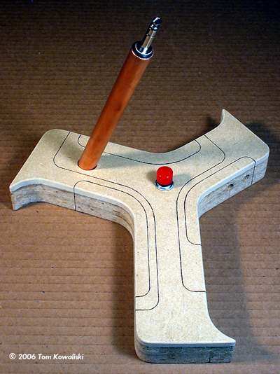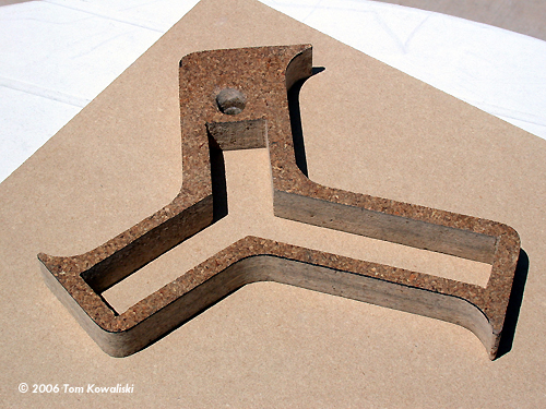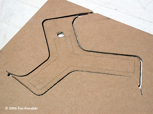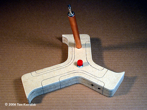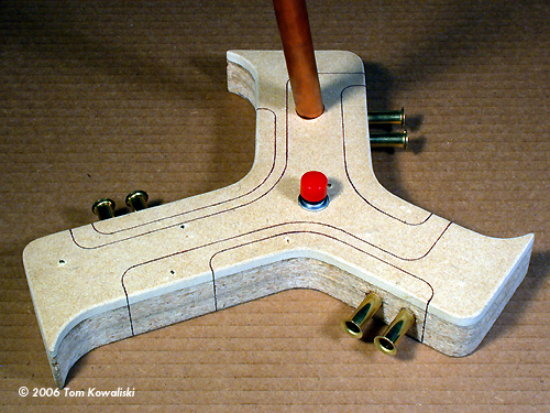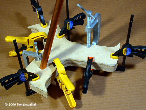 Image: Positioning the stand hole at the proper angle Image: Drilling at the correct angle Image: Riser and pattern in place Image: Pattern drawn on the board Image: Starter holes drilled Image: First the inside is cut out Image: Then the outside cuts are made and everything sanded smooth Image: The base is used to draw the pattern for the top plate Image: Top plate cut out Image: Thin but strong Image: Glued and clamped Image: Sanded and ready Image: Holes drilled for hot rod exhaust