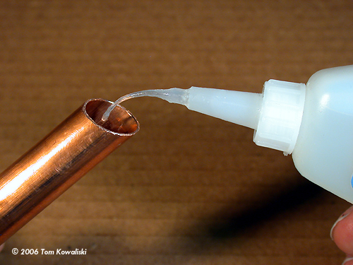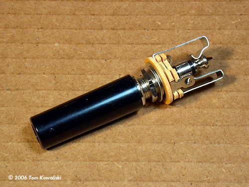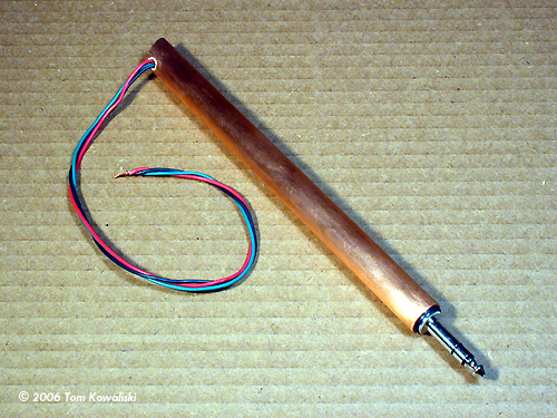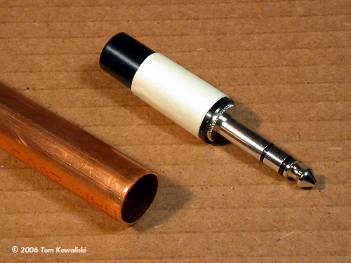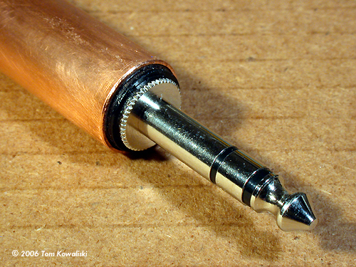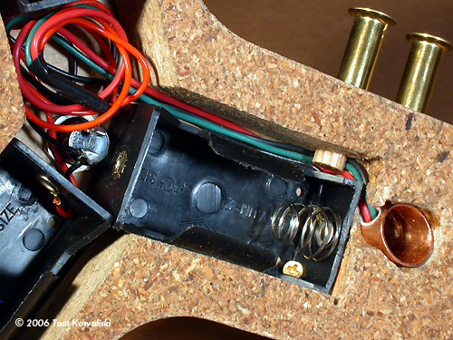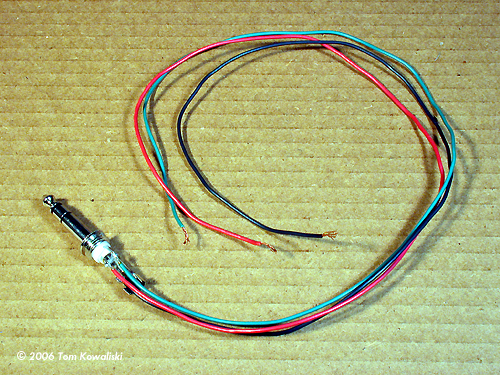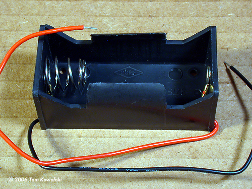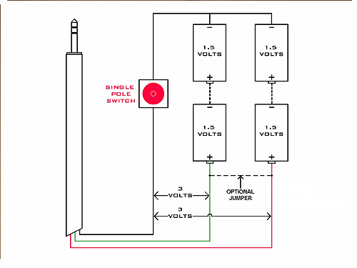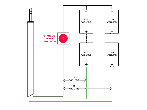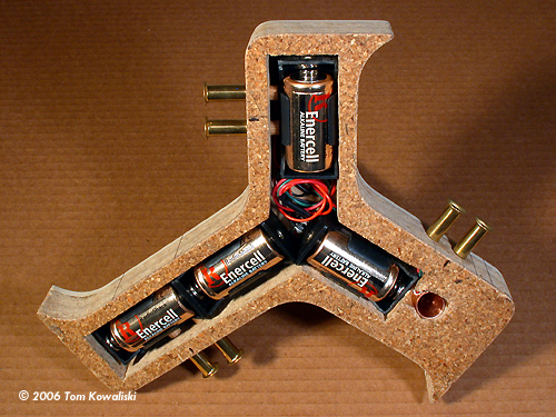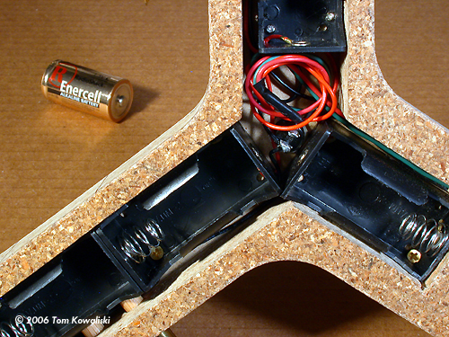 So with the guide, the angled riser hole was drilled and the pipe was temporarily inserted. Now the base's design was traced in a position around the pipe where the ship would be fairly centered above the pattern. It was now almost ready to cut out. But I knew more adjustment would be needed later with the angled riser's height to get the model exactly balanced above the base. Before cutting out the pattern, the battery placement needed to be determined. They would just be sort of lined up and stuffed inside the three spokes somehow. After some measuring I drew the inner lines where the cavity would be cut out for the four C-Cells. That was cut out first and then the outside base pattern was cut out around that. After some sanding, the base was then flipped over to trace its pattern on a ¼” piece of pressboard that would serve as the top of the base. Using the adjustable angle guide again, another riser hole was cut (duplicated) in the pressboard. A pipe was then pushed through the top pressboard and the base to make sure everything lined up. The two surfaces were pressed together again and then the base was traced on to the pressboard. After cutting it out, it was then glued and clamped to the base to dry for a day (with the pipe temporarily inserted). The new top cover was then feather sanded to the defining edges of the base. The three spoked plug was basically done and ready for wiring and stone work. Before doing any wiring though, the hot rodder in me took over and I stated thinking about where to mount some exhaust pipes on the base. (Don't try to figure it out, I just wanted em) I decided that dual pipes would exhaust right out of the sides of all three spokes. So I drilled some holes there for six wooden dowels that would hold the pipes later. I also got the urge to draw a design of how the Insta-Rock would be segmented on the base. It would be the guide for the stone mason's job later. Well, as it turned out, drawing the stonework design on the base was both a good idea and bad idea too, which I'll explain in the part three. Part Two: Wire The angled riser was still a problem. As stated earlier in part one, the riser's length had to be fiddled with a bit more to get the mass of the ship centered safely above the base. And it had to look “Right” in that position too, where ever it ended up. This was easy enough done by temporarily mounting the ship on the copper pipe and just moving the pipe up and down through the hole until the ship was in the right position, and then just marking the pipe and cutting it. So with that finally done, the riser was cut to length and sanded smooth. Now it could be transformed into an electrical conduit that would contain the male stereo jack and the wiring to run down into the base. As a safety precaution, I also added a little plastic insulator sleeve in the pipe's bottom side wall to allow the wires to pass through unscathed. The typical ¼” stereo jack available at any Radio Shack is a great little device to use for mounting a ship, with the intent of lighting said ship. They are very strong and allow the model to rotate quite freely while delivering the juice to the LEDs. Even the smaller 1/8” mini jacks are stout enough to support a descent sized model. But the Black Wind is quite heavy. It's filled with lots of lead in its rear end as counter weight. So because of the dimension and mass of the ship, I chose the stronger ¼” jack which could more easily support its display angle on the base. When I had previously installed the jack's plastic insulator in the ½” copper pipe, I noticed that it did fit a little sloppily. But a little masking tape rapped around the insulator eliminated all that slop and allowed a very snug and strong fit. A little super glue trickled down the riser barrel locked it in place nicely. I then fed the wires into the pipe and screwed the ¼” jack into the threaded insulator. Three wires soldered to the stereo jack delivered the juice of two circuits from two battery packs to the ship. I wanted a simple circuit for the base this time but I still wanted two isolated circuits feeding the fifty-plus LEDs in the ship. Sometimes the “bouncing” load of one batch of blinking LEDs (or even one blinking bulb) can cause a spasm in the brightness of other non-blinkers. Isolated circuits would help alleviate that problem. And both circuits could still be turned on and off with one single pole switch breaking the common negative wire going to both 3 Volt battery packs. (See the simple wiring diagram) In truth though, the larger the power source you use to feed an LED circuit, the less chance there is of any bulb affecting the performance of another. All the LEDs are just fed better. So an alternative to my dual circuitry would be to just connect all four batteries in a series/parallel hook-up (as one pack) to still give 3 volts, but at double the wattage capacity. All it would take is just a jumper wire across both positive battery leads to make it all one big battery pack feeding one big circuit. I've already tried that and it worked well, so I may reconnect them that way at a later date. (See “Optional Jumper” diagram) Before mounting the battery holders in the cavity, I went ahead and shoved the assembled copper riser in the base and super glued it in place. I also decided it would be a good time to mount the little single pole switch in its hole. I had already done a lot of pre-measuring even before starting this project so I knew all the components would fit, but it would be a tight fit. So the switch went in and the lock nut went on underneath, and tightened with needle nose pliers. That allowed just enough room for the battery holders to butt up to the switch. I used the smallest screws I had to mount the holders in the base cavity. They still managed to poke through the top plate a little so I cut them off with my Dremel. There was just enough room alongside the battery holders for wire connections 