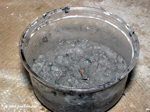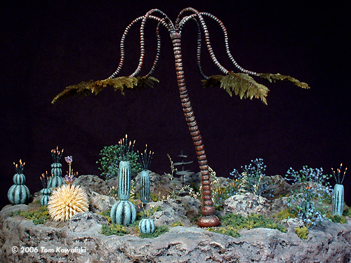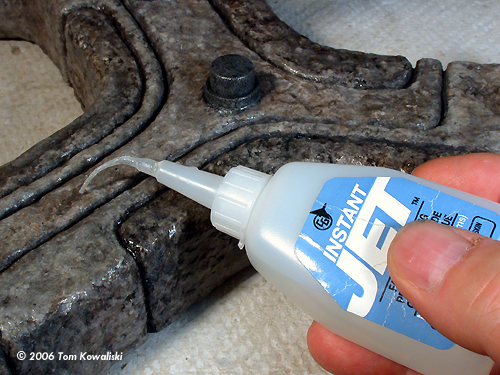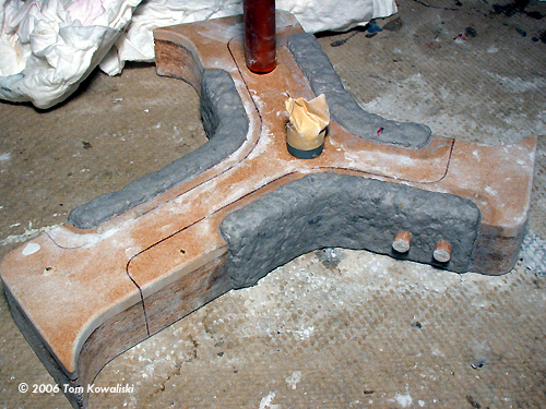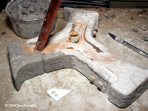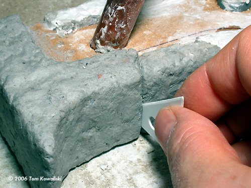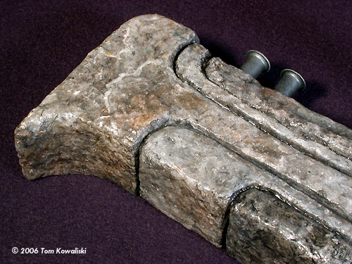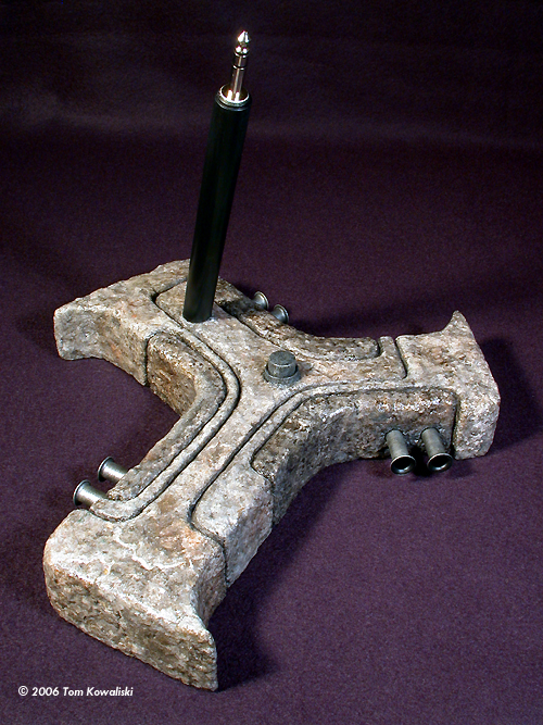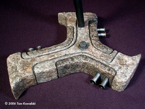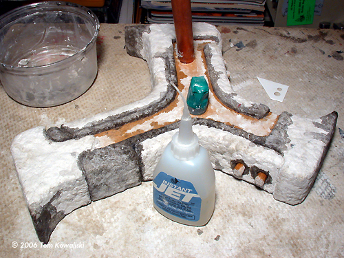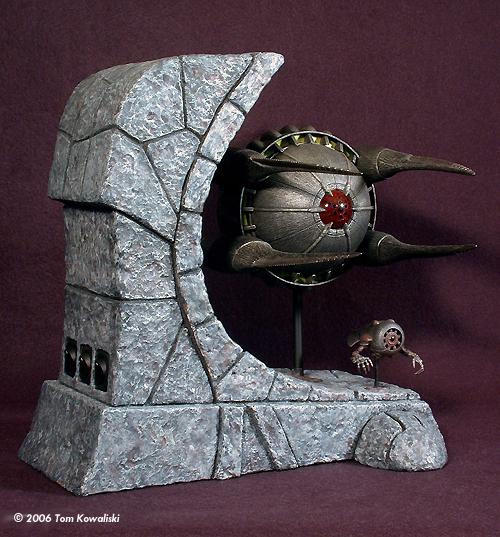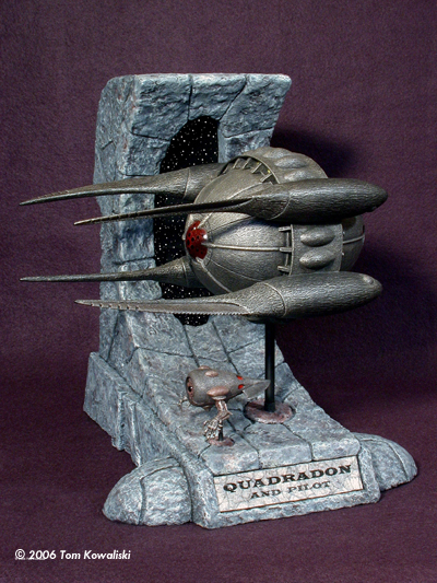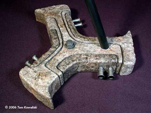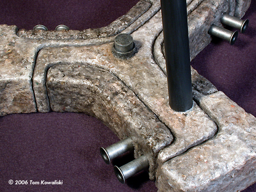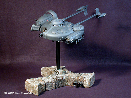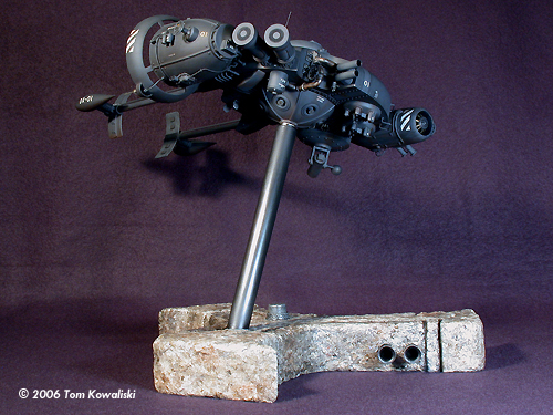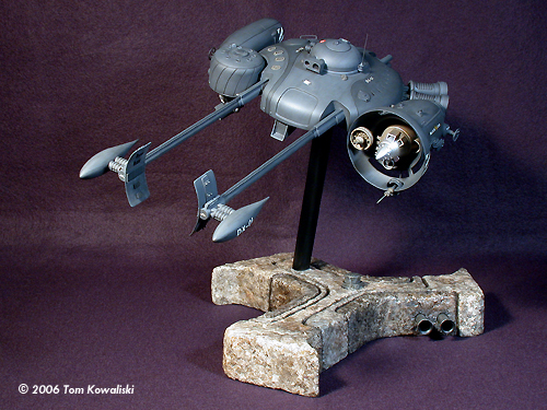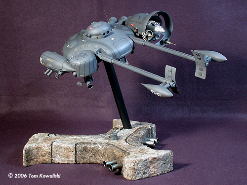 The only colors I added were a slight black wash for the inside corners to give it just a bit of contrast between the blocks, and a tiny bit of brown here and there for some subtle rock colorations. Games Workshop acrylics were used for the thin water washes. But aside from the minor wash treatments, this thing almost painted itself just using the CA glue. I decided that the base looked good with the glossy superglue finish so I went ahead and gave the thing a little more CA where the colored washes had dulled some of the surface areas. I just though the base looked better as a “polished stone” sort of display, and it looked good sitting on the cherry wood desk that way too. And it also seemed to enhance the flat weathered look of the ship. Now all that was left to do was paint the copper riser and the exhaust pipes. The riser got a coat of Testors Flat Black out of a spray can, then a semi-gloss clearcote after that. The six exhaust tips were also sprayed flat black and then dry brushed with Testors Steel. Then they got a coat of clear flat to protect them. I glued the pipes on the base and was just about done. The last bit of painting was on the bottom of the base. It received a brush coat of Testors Russian Earth Gray which seemed to blend in with the rocks pretty well. For the base's foot pads I tried something a little different than the typical felt pads I'd always used. I had some tiny black plastic doll eyes, the type with mounting pins molded in. I drilled two holes in the bottom of each of the stone spokes and stuck them in. The three spoked base now sat nice and level on the desk with just a sixteenth of an inch clearance. Good enough. Conclusion The Black Wind was seven years in the making and I'll never forget the day it was finally finished. Getting its display base also done was icing on the cake for me. I hope everyone enjoyed the build and that it sparked some interest in building your own base, or trying your hand at stonework. I've also included some photos of other bases I've built in the past so you can get an idea of other types of building materials. |