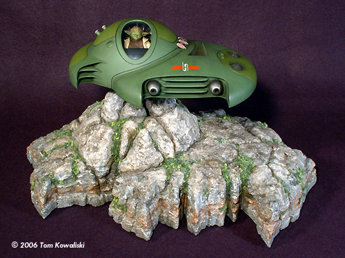 Image: Stonework pattern transferred to the base Image: Ready for wiring Image: Male and female stereo jacks Image: Strong rotating connection Image: Tape wrap ensures a snug fit Image: Insulator inserted Image: Ready for glue Image: Gravity does the work Image: Evergreen insulator Image: Wires soldered to the jack Image: Jack installed Image: Wires run through the insulator Image: Finished riser Image: Push button Image: Installed ^ Basic construction complete Image: Another look Image: Wooden doels to hold the exhaust pipes Image: Dowels in place Image: Flared pipes Image: It's a tubing sleeve Image: Test fit Image: Battery holder ^ Battery holders in place Image: Wires threaded along the side Image: Wiring finished and tested Image: Screws poked through Image: Painting the switch button Image: Turned to stone Image: Workings protected Image: Diagram: Dual Isolated Circuit Image: Diagram: Optional Jumper for single circuit Image: Insta-Rock Image: Put it in a bowl Image: Add water Image: First layers Image: Scribing Image: Let dry a day Image: Looking good Image: Superglue for strength Image: Sealing the whole base Image: Rock hard Image: Painting the pipes Image: Masking off the riser Image: Paints Image: Drybrushed with Testors Steel Image: Exhausts in place ^ Done! Image: Acrylic washes add color and bring out detail Image: Another closeup Image: Model in place Image: Another look Image: More Image: More Image: More ^ Ceiling tile used to mimic rock 'strata' Image: Ceiling tile and insta-rock Image: Another base using scribed insta-rock Image: Other side Image: Ceiling tile and tree bark for terrain Image: Another tile base Image: Scribed particle board and pressboard ... Image: Simulating cast iron |