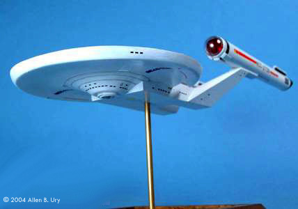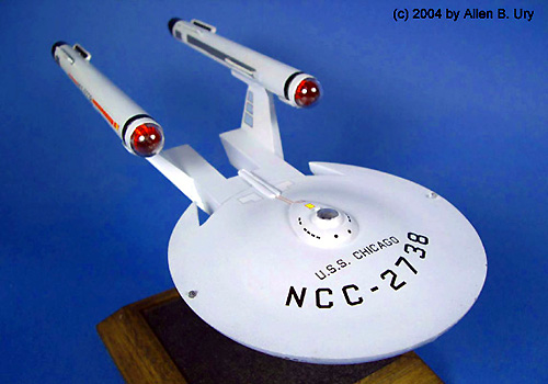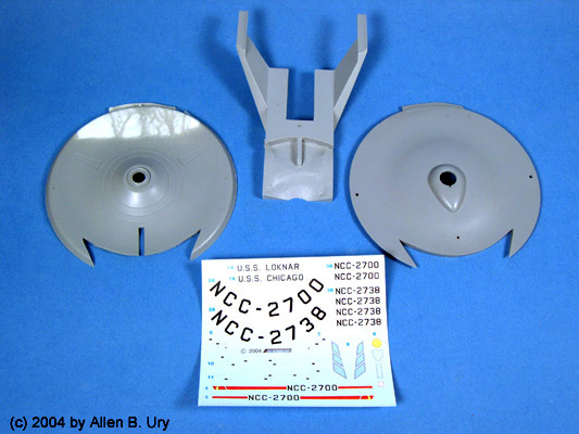 Decals Decaling took me about two sessions. I began with the ALPS decals from JT graphics. The sheet allows you to build either the U.S.S. Loknar or its sister ship, the U.S.S. Chicago. I started with the Loknar but the ALPS decals, being awfully thin, tore badly on my first attempt, so in a nod to my home town, as well as cold necessity, I went for the Chi-Town. Be very careful when working with ALPS decals. They're thin. They're fragile. They're unforgiving. And if they curl up on themselves, then may God help you. The Polar Lights decals, which were needed for saucer and nacelle details, were much sturdier and easier to apply. Since the Loknar is a non-canon ship, I felt free to “noodle” around with my choice of decals and decal placement, and I heartily encourage others to do so as well. If you can't have fun with this hobby, then what's the point, right? Once the decals were dry, I airbrushed an overcoat of Future floor polish for that tough, long-lasting shine. The final photos speak for themselves. Last Word The Polar Lights “U.S.S. Enterprise” has been a godsend for sci-fi modelers, not only because of its accuracy, but because its laughably low price and ease of assembly makes it a boon for kitbashing. For those interested in building out a fleet with widely recognized, albeit it non-canon designs in 1:1000 scale, then this U.S.S. Loknar kit is a great choice. The casting and fit are superb, the resin itself in virtually flawless, and the final product is unquestionably eye-catching. I enthusiastically recommend this kit to “Star Trek” fans young and old. Hey, John, keep 'em coming! Many thanks to DiscoverCard for paying for this kit. |