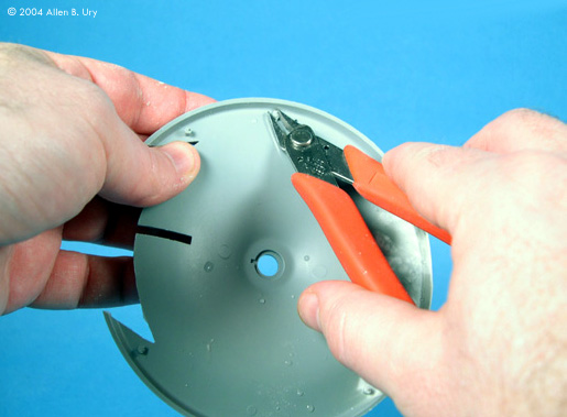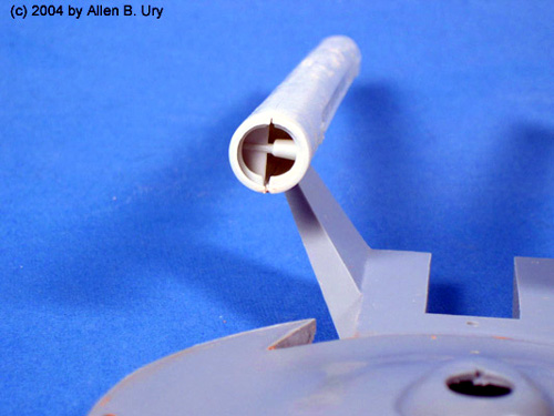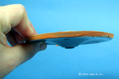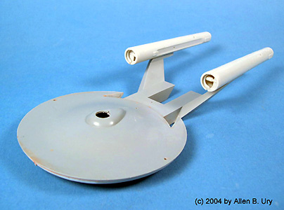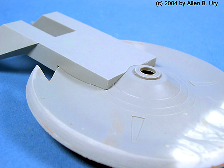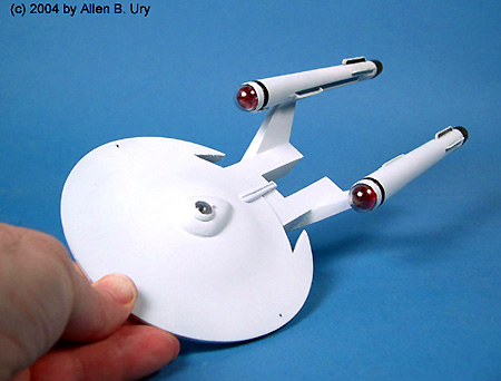 Image: Saucer halves Image: Pour stub on the top saucer half Image: Removing it is straightforward Image: Bye-bye, connector pins Image: Puttying the seams Image: The mysterious rear detail (actually, it's the shuttlebay door, if I remember correctly - Ed.)Image: Pour stub on the engineering hull Image: The hull and saucer fit well ^ Adding the nacellesImage: Nacelle alignment ^ Ready for decals