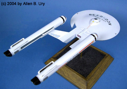 Examining the engineering section, I noticed an interesting bit of asymmetry. There's a square indentation - impulse engines? - on the starboard stern section of the piece, but nothing at all on the port side. An error in sculpting, or part of the original FASA design? I await an expert's verdict. I also noticed an odd little notch on the starboard side of the piece, which I assumed was what remained of the pour stem. This I removed with a coarse sanding stick, followed by a medium sanding stick, following by a fine sanding stick, followed by an extra-fine…anyway, you get the idea. As stated earlier, the engineering section fit spot-on perfectly with the saucer section, and I easily Super Glued it into place. Next game the nacelles from the Polar Lights kit. Once assembled, they sat snugly in their “saddles,” but had to be aligned perfectly perpendicular to the saucer by eye. For the interior Bussard collector crystal, I bypassed the clear pieces provided by the PL kit and instead used a solid red aftermarket crystal from VA Miniatures, available from Federation Models. (Note: As per the PL instruction sheet, these crystals should be fit into place before the nacelles are assembled. Naturally, I didn't read the instructions and had to find a way to perform this task subsequent to assembly. Thank heavens for sanding sticks.) Paint The finished model received a coating a sandable grey auto primer, then an outer coat of Tamiya White Acrylic mixed with just a hint of Acrylic Grey. After a little hand-detailing with Testor's black and grey enamels, I prepped the model for decals with a light coating of Testor's Gloss enamel. |