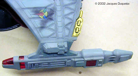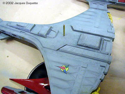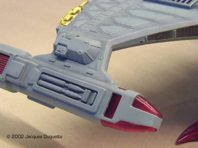 I next applied the decals. I only added the Klingon Tri-logo decals as I thought the others looked to unrealistic, even for me. I then allowed the decals to dry for about 1 hour and then recoated the model with the clear Future floor polish mixed with a small amount of Tamiya Clear Green, about a 1:20 ratio. I had to add a small amount of rubbing alcohol as well to get the paint to mix well with the Future. The resulting liquid should look like Green Kool-Aid. I applied a light, wet coat. I let the kit dry for 24 hours. Then I applied another coat of clear Future with Tamiya Clear Blue that was a little bit stronger in color, and I again had to add a little rubbing alcohol to get the paint to mix well. I am sorry I do not have exact ratios, but experimentation should give you a good idea of what you are working with. If in doubt, spray on a piece of scrap plastic first to see the effect and if you need to thin it out more. This will give the desired green and blue effect, with a sort of grey appearance underneath. Now to drybrushing. I am assuming you the reader understand this technique. I started with the basecoat, PS Light blue. Then I selectively and carefully drybrushed with ModelMaster Camouflage gray. This is mainly used to highlight panels on the top deck and to accentuate the edges of main pieces extending up, like on the bridges and such. Take care not to overdo this technique. Less is often better. I then proceeded to paint the windows on the bridges and hull in a random pattern of what was on and off. I used PS black and MM Camouflage gray. I do not like using straight white as I think it is too harsh a contrast. I left the area on the right side of the hull, when you face the kit with the engines furthest away from you, with a patch of the lights painted black for a damaged area I planned on adding later. I also painted the "disruptor blocks" on the end of the ship in Tamiya Flat Yellow. The square "bumps" behind the main bridge and the impulse inlets on the front of the "wings" were painted MM Armor Sand. The "warts" on the battle module were painted MM Sand. These seemed to be good matches to the colors I saw on the studio model. Next, I added parts 304 and 305 to the Warp Engines. I glued them with the Testors clear parts glue, which works better than Elmer's glue for clear parts if you ask me, and admit it: you did! At this point, I painted all the parts that had been clear red, but painted over, like the impulse engines, warp drive radiators, and Deflector lenses with the Polly S Flat Aluminum. Let this dry about 1 hr. I then overcoated with Tamiya Clear Red, taking care to put a thick coat over the silver. I let this dry about 1 hour, then recoated any spots I thought need a "redder" look. (On reflection, I may have rather painted them Tamiya Yellow and then coated them with Tamiya Clear Red. It is something I will experiment with on my next project.) |