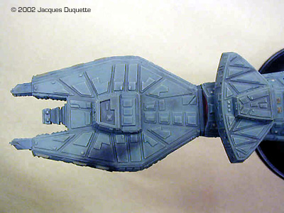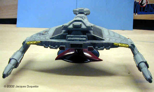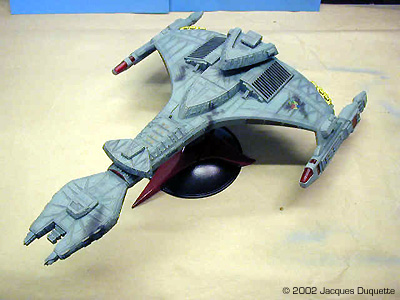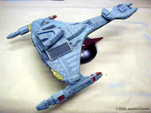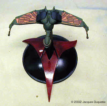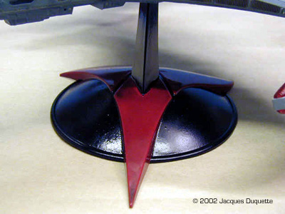 I now added "phaser burns" using the pastel chalks. I was not looking to add major damage, just the look of minor hits to add a little interest to the look of the ship. This is nothing more than a light dabbing of powdered up pastels dabbed onto the model with a brush. Then I used a powdered dark gray pastel in the brush to darken up the panel lines on the kit. Pastels can be very hard on brushes, especially if you use them for accentuating panel lines, so I use a older brush in the 0 to 1 range for this that I will never use to paint with again. I only applied pastels where natural shadows would occur, to help the 3D illusion. Also, take care not to touch what you have applies pastels to, or you will leave fingerprints that are a bugger to remove. Now I coated the whole ship with MM Flat clear to lock down the pastels. I let this dry 1 hour, looked over the pastel work for any touch-ups needed, applied said touch-ups, and recoated those areas with flat clear. Again, I let this dry for 1 hour. I then applied MM Gloss clear to the base, and painted all of the engine parts and deflector panels with it as well. This, in my opinion, helps give the illusion of the engines being on without the need to light them. I like the effect anyhow. Finally, I decided to add a brass tube to the base and put a smaller diameter one in the ship to help reinforce it for display. I drilled a hole on the ship where its natural balance point was on the base and added tubing. I then added the larger tubing to the base piece and ran it through the baseplate so that it would rest on the table surface and help support the kit's weight. The tube on the base was painted black, the one on the ship should not be painted so it will fit in the tube in the base. Overall Impressions The ship was put on the base and it was done. Comparing it to drawings in Star Trek: The Magazine, a couple of cards from the CCG Star Trek card game, and to pictures off the web, the model really captures the look of the Vor'Cha very nicely. Compared to the studio model, for its size the kit has a excellent level of similar detail. I really enjoyed this kit and can recommend it to anyone who wants to build it. I also hope this helps all those painters out there who want to get a nice effect on the hard-to-capture paint scheme. |