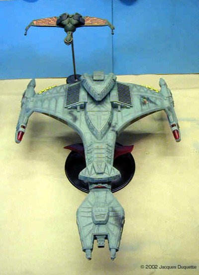 Image: Tinted parts and main hull pieces ... Image: ... and the rest of the parts Image: Paints and supplies used Image: Looking down the throad of the disruptors Image: Side view of the "fangs" Image: Top view Image: Looking over the bow at the bridge Image: Closer look at the bridge Image: Side view of the "neck" Image: Looking back along the top of the hull Image: Overhead view of the same area Image: Port "wing" and warp nacelle Image: Close-up, starboard side nacelle Image: Rear view Image: The kit-supplied stand hides the brass tubes Image: Base with brass tube Image: Brass tube inserted in the ship |
