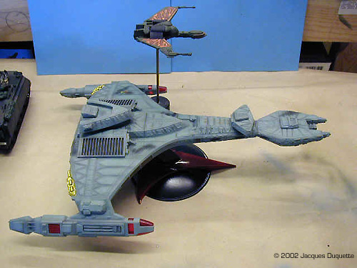 I took a few pictures of the kit next to the Bird-of-Prey from the AMT/Ertl 3 piece adversary set. I think they match well if you consider the BoP to be a B'rel class scout.