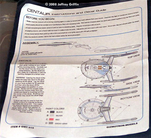 Gizmotron Models has given us an ever larger number of great Star Trek related kits and decal sheets over the last couple of years. All of them have been of excellent quality and this Centaur-class 1/2500 scale kit is to the standard of excellence that we've come to expect. The Centaur-class starship first appeared in the late '90's in an episode of Star Trek: Deep Space Nine. We've not seen even a single example of this design since that episode, "A Time To Stand". I was never a big fan of the design for some reason, but had slowly grown to like it as time wore on - if only because it was different than most of the other Star Fleet designs we've seen over the years. It's still an ugly "Frankenship" in my mind, though. |