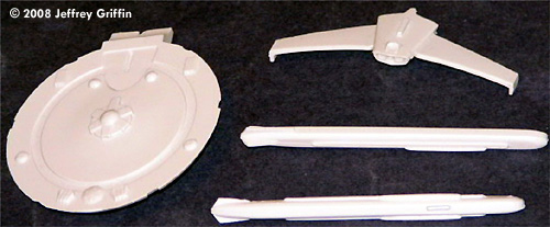 However, other fans of Star Trek have wanted a kit of this particularly design - there's at least one in 1/1400 scale of which I'm aware - and now 1/2500 scale fans finally have a complete kit for their collections - no kitbashing necessary. What I Got The kit comes packaged in a ziploc bag with the decal sheet and instruction sheet and a nice label at the top of the outer ziploc bag. The model parts themselves are packaged separately from the instruction and decal sheet. You get a total of four resin cast pieces: one each primary hull, wepaons pod/warp nacelle pylon assembly, and two warp nacelles. A one-page , full color instruction sheet is included. The resin appears to be the standard gray resin that we've come to expect from Gizmotron the last two or so years. The resin pieces have only a touch of flash. While some seam lines are apparent, they're easy to take care of with a bit of Xacto and sand paper. Detail is crisp and clean and consists of mostly raised surfaces on the exterior of the hull. The are no docking ports, windows, deflector grids or phaser "bumps", but the detail parts on the upper and lower hull that can't be duplicated with decals are present, as are the photorp emitters and raised detail on the nacelles. The shuttlebay area in front of the bridge is present and looks to-scale, as are the impulse engine domes. The lower sensor array and impulse engine vents are recessed areas. |
