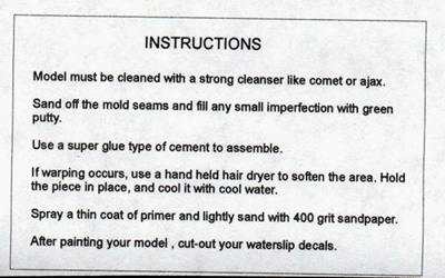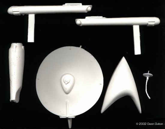The parts are moulded in white resin with a somewhat powdery surface. This appears to be talcum powder used as a mould release. The suggestion in the minimal instructions to scrub the parts with a household cleanser should serve to remove this. The parts are broken down into saucer, secondary hull, left and right warp nacelles, and the sensor dish. Pour stubs and mould seams are about average, but the mould the secondary hull of my copy was taken from was beginning to age - a minor seam collapse was visible around the docking bay beacon, and a tiny bit of excess resin was clogging the slot for the dorsal. There were a few minor bubbles lurking in the leading edge of the saucer, and in the intercoolers on the starboard nacelle. The rings on the forward end of the secondary hull around the mounting point for the sensor dish are very delicate, and half of one ring was chipped away on my sample, but this will be easy to replace with stretched sprue. The spire on the sensor dish was bent and will need to be heated and gently bent back to shape. There is a prominent mould seam across the sensor dish which may be a bit tricky to remove. |