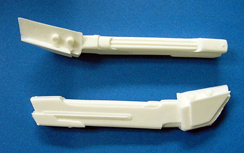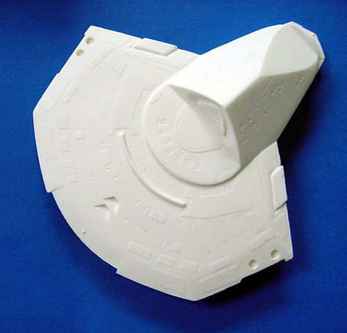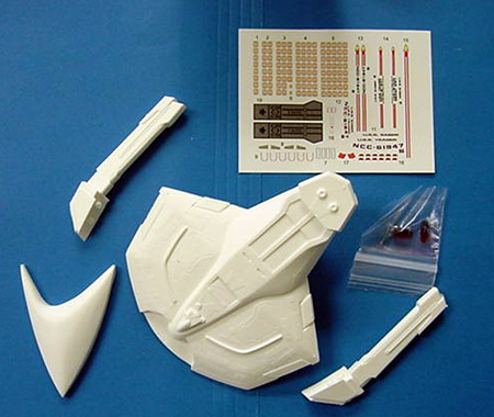 What You Get Inside the sturdy box are four white resin peices (ship and base), two clear resin pieces tinted red (bussard scoops), decals and instructions. The resin bits are almost entirely clear of defects (as befits a brand new mold!), though I did find a few bubble lurking just under the surface of the hull, and a noticeable mold seam along the back of the hull. The resin is smoother and harder than previous ships I've gotten, though I don't know if that's because the company is using a new resin, or because I bought the last kit last year. The red bussard scoops are almost water clear, and free of bubbles.The base looks a bit small to hold the model up without tipping (not that I'll use it anyway) and you'll need to supply your own brass rod or other support. Detail is uniformly sharp throughout and consists of engraved windows and raised panels. The only flaws I could find were that several of the windows on top and under the primary hull are a the slightest bit crooked. It's not apparent at all unless you put your eye three inches from the surface of the model, however, so I'm not overly concerned. A fairly extensive waterslip decal sheet, ALPS-printed by Starcrafts, is provided. Markings, including lifeboats, are provided for USS Yeager and USS Saber, though to do Saber you'll have to cut out the last number on the registry and replace it with the spare provided. The decals are perfectly registered and knowing JT Graphics' quality, I'm sure there will be no problem in using them. Speaking with Starcrafts' owner, I learned that the two upper hull grey panel decals (with the black borders) are slightly long and will have to be trimmed back to fit - the second run of the kit will have this corrected. Rounding out the package is a one-page instruction sheet. Almost all of it is taken up by diagrams showing decal placement and painting notes. Is it accurate? As far as I can tell with my resources, yes (but I do not have good underneath views). Some of the detail underneath may be conjectural, but if so, it's convincing. Assembly and Finish Assembly should be a no-brainer. The warp nacelles are keyed such that you can't put the left nacelle on the right side, or vice versa. After clean-up, you simply superglue the nacelles on, prep and paint the model, add decals, then clear coat. I'd suggest holding off on the installation of the bussard scoops until everything else is done. After the nacelles are attached you will need to trim down the upper edge of the nacelle pylon - this was intentionally made long to aid in getting the join perfect via sanding, not putty. Fit of the main pieces is superb. ConclusionsI like it. It's a unique design (something different than saucer and nacelles at any rate), and the kit looks simple enough to be done over a weekend, even for someone as slow and obsessive as myself. Highly recommended! |