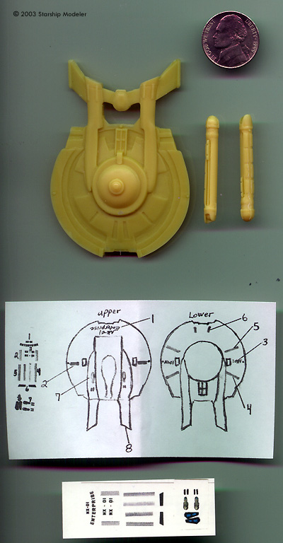 Even though Enterprise hasn't really connected with viewers, the Enterprise NX-01 has been (mostly) a hit with modelers. This kit is the second 1/2500 offering released this year. What You Get Inside the baggie are three nicely-cast resin parts, a small sheet of decals and a hand-drawn decal placement guide. The resin pieces are well done, with no pits, bubbles or other defects visible on my sample and only a little flash. There are three pieces: hull, and two warp nacelles. Detail is crisp and clean throughout - the warp nacelles are pretty impressive, actually. There are some rough surfaces - if you tilit the main piece just right in the light you can see the saucer's surface isn't completely smooth and uniform. Some careful sanding sould take care of that quickly - I'd prime the hull in a light grey or silver to make any irregularities stand out, then wet sand it with 400 - 600 grit sandpaper. There is no assembly guide, not that one is really needed - though it would be nice if a diagram of exactly where the engine attaches to the pylon, and which way the details face, had been included. There are enough images of the "real" ship available that figuring out where the nacelles go should not be impossible. Decals are now ALPs-printed by JTGraphics. A slip of paper included that shows where each decal should be placed is included, and appears sufficient for the purpose. |
