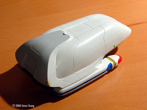 The smooth curved shape of the hull was difficult to model in a full scale mockup, and the Type 7 was eventually superseded in the series by the geometrically simpler Type 6 shuttle. Unlike other ships from the series, I have never seen production kits or replicas of the Type 7, so I was excited when I found out about this kit. This kit was intended to represent the original concept design of the shuttle, mainly identifiable by the long side windows. The decals and marking instructions follow this configuration. I wanted to build the model in the configuration as it was seen in the fourth season of the television program, so this required the creation of a number of custom decals. Parts The parts, instructions, and decals are packed in a cardboard box with foam pellets. As mentioned in a preview of the kit, the designer's autograph is on the outside of the box. There are the main hull and two engine nacelles, made of resin. The nacelles are identical and interchangeable between the starboard and port sides. An odd thing about the three parts is that they were all cast in different colors of resin. One of the engine nacelles was molded in pink, which made it require quite a bit more primer to paint correctly. The most significant issue encountered with the parts was a noticeable amount of pitting near the forward end of the main hull. Applying a small amount of modeling putty and sanding resolved the problem. The construction is very simple, and the positioning of the engine nacelles is pretty self-evident. Painting The majority of the effort in making this kit was the painting and detailing. Most of the hull is a two-tone color scheme. The instructions call for FS37722 for the upper side of the hull. Not being able to find a model paint with that FS number, I used the closest match I could find, "Aqueous Hobby Color" H21 (Off White) for the upper hull color. The interface between the two colors wraps around the back part of the hull, and the boundary is difficult to mask. I found it easier to paint the lower hull color first. I chose to paint the engine nacelles in a "powered up" appearance. The parts of the actual filming miniature are translucent and illuminated by lights, and so look black when they are powered off. The instruction sheet recommends FS28915 (Fluorescent Red); this looked too orange by itself. I created a mixture of Testors No. 4632 (Guards Red) and Fluorescent Red to approximate the color in photographs. Not being able to find FS 23564, the panels with the aft RCS thrusters and position lights were painted FS33613 (Radome Tan). |
