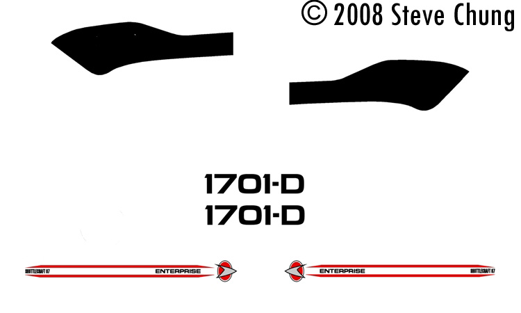 The RCS thrusters and the recessed band on the engine nacelles were painted FS33538 (Insignia Yellow). The long grilles on the sides and rear of the nacelles were painted with Tamiya X-14 (Sky Blue). The position lights were painted in the standard aeronautical fashion, red on the port side and green on the starboard. The strobe on the top of the hull was painted white. Decals The included decals were used for the ship name. The standard position for the shuttle name is between the forward position lights and the aft end of the window. "Galileo" (number 07) was the only name of the three that was short enough to fit neatly on that area of the model. Instead of the long red stripes, long windows, and registry numbers included on the decal sheet, I used Paint Shop Pro and created a new registry number (truncated in the 4th season fashion) and shorter side stripes/insignia. Shorter side windows were made to match the production filming miniatures. The new insignia were printed on transparent decal paper using an inkjet printer, and a protective coat of Testors Decal Bonder was applied. The deck graphic shown in the photos was made in Paint Shop Pro based on screen captures from the program. It was simply printed on regular paper and cut to fit a display case. Overall This was a simple kit that makes an accurate representation of the craft. Some modifications to the markings are needed to make production variants of the shuttle. This is pretty much the only model of the ship out there, and it is well worth it. |