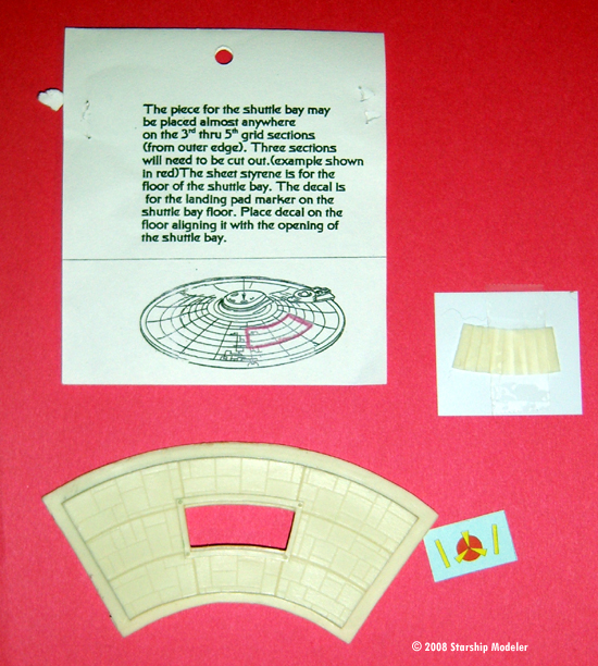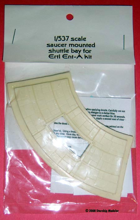 What You Get Inside the bag are two resin parts, a slab of sheet styrene and a decal. The resin parts consist of a section of the upper saucer with an opening for the shutlles, and a fan-style door. The styrene and decal are for the floor of the bay. Simple instructions are printed on a card stapled to the parts bag. Casting is nicely done; I found no pinholes, bubbles or other flaws on my sample. The main piece is intended as a drop-fit replacement for a section of the saucer - anywhere between the third and fifth rings engraved onto the model. It is covered with a scribed pattern that matches the later editions of the base kit. The decals and instructions are very simple - but this is a very simple accessory. Using It I have very few Trek kits in my stash anymore, but I do have one AMT refit I've held onto in order to build up as a Dreadnaught conversion. My kit is a "smoothie" - one of the first issues after ST:TMP came out, before AMT went nuts and engraved an utterly fictional panel pattern on it. I think the engraved detail on this, while more restrained, is still too deep and wide. As I intend to fill it all in, I'm not really worried about rescribing anything that gets messed up while I add the shuttlebay.. |